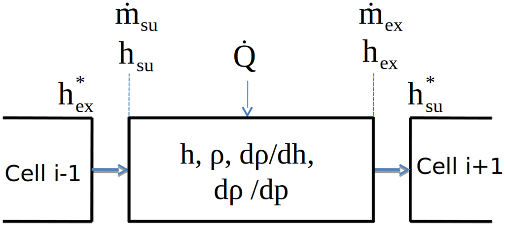 The overall flow model is finally obtained by interconnecting several cells in series. This kind of discretization corresponds to a staggered grid, i.e., the thermodynamics states and the state variables (the enthalpies) are calculated inside the cells and the node values (“su” and “ex”) are deduced using Equations (4) and (5). In a collocated grid, on the contrary, the state variables are the node variables, and the cell variables are deduced.