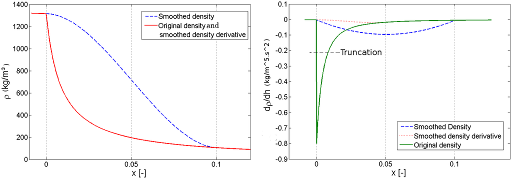 The main drawback of this method is that the density function is still calculated with the original equation of state; the smoothed density derivative is not consistent with the density function provided by the equation of state. This might cause a mass defect during the simulation.