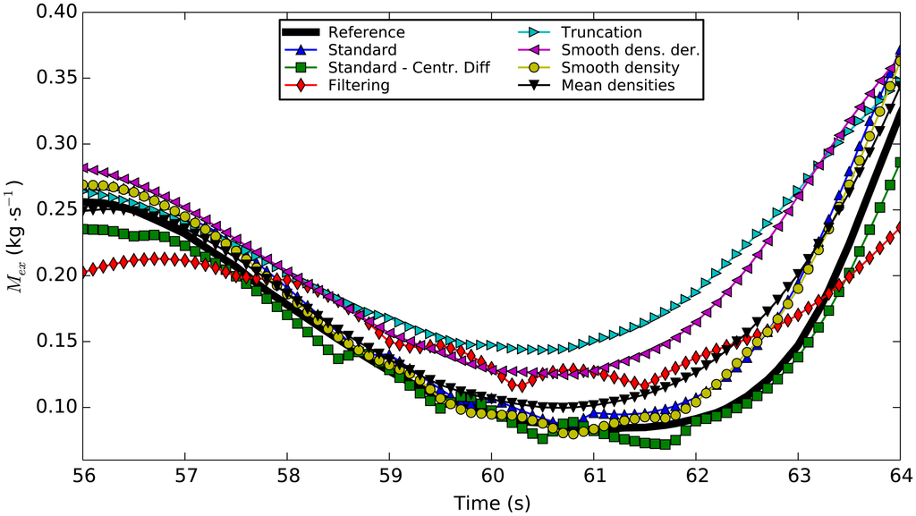 Figure 4. Sample of the simulation results with the different methods (when not specified, the upwind discretization scheme is used).As shown in Figure 4 for a highly transient part of the simulation, the differences between the predicted exhaust flow rates are significant. The profiles that match best the reference profile are the standard model, the smooth density method and the mean densities method. The standard model (both upwind and central differences) undergoes abrupt changes in the predicted flow rate, each of which correspond to a cell crossing the liquid saturation line (and, thus, numerically generating a cell flow rate). With the smooth density method, the variations are lower, while they totally disappear with the mean densities method.