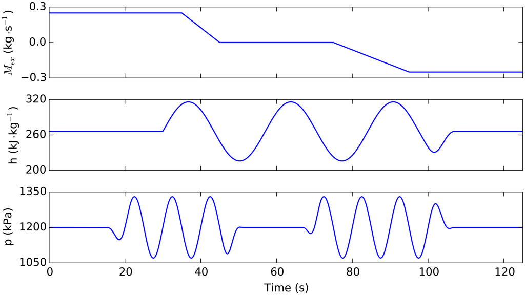 This first test aims at characterizing the simulation speed of the different methods. To that end, the system presented in Figure 3 is submitted to enthalpy and pressure variations, but these variations are limited to avoid any back-flow or state event generation. As a consequence, none of the above-presented methods should undergo any simulation failure in this test. The boundary conditions for pressure and enthalpy are defined as follow: