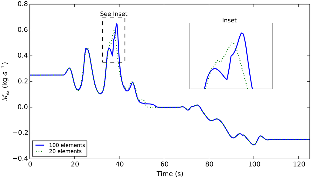 Table 2 shows that, using the standard model, the error on the mass and energy balances varies between 0.2% and 0.3% and between 0.4% and 0.8%, respectively, depending on the discretization scheme. These figures, although small, are not negligible. It should be noted that the selected numerical relative tolerance for the integration algorithm (DASSL) is set to 10−4. Setting the tolerance to 10−6 significantly reduces the error (between 0.02% and 0.07% for the energy and between 0.009% and 0.011% for the mass). In this case, the simulation time is multiplied by a factor close to 10 (46.6 s for the upwind scheme and 49.5 s for the central differences scheme). Since 10−4 is the default value used in most simulations, the reference error values will be the ones related to this tolerance. It should also be noted that simulation speed can vary between different simulations of the same model. The maximum stated difference was about 0.5 s. The provided simulation times should therefore be considered as indicative only.