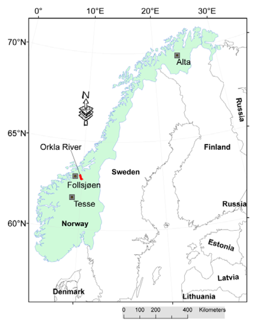 For the future climate analysis in this study, the data used comes from multiple sources. For the winter (climatology) indices and reservoir ice cover studies, future scenarios corresponding to the Intergovernmental Panel on Climate Change (IPCC) A1B emissions scenario from two GCMs (HadCM3Q3 and ECHAM5) downscaled by the RCA RCM from the Swedish Hydrological and Meteorological Institute are used. For the river ice case study in the Orkla basin, we used data from two GCMs (HadAm3H, A2 and B2 emissions scenario; and ECHAM4, B2 emissions scenario) downscaled to a 25 km resolution by HIRHAM RCM maintained at DNMI, and bias-adjusted and interpolated to a 1 km × 1 km grid covering the whole of mainland Norway [32]. As noted above, the future scenario data used are not the same for the different studies because the studies were conducted in different project settings. Figure 1 shows the locations of the study areas (mainland Norway, and the three reservoir sites as well as one river site used as case studies).