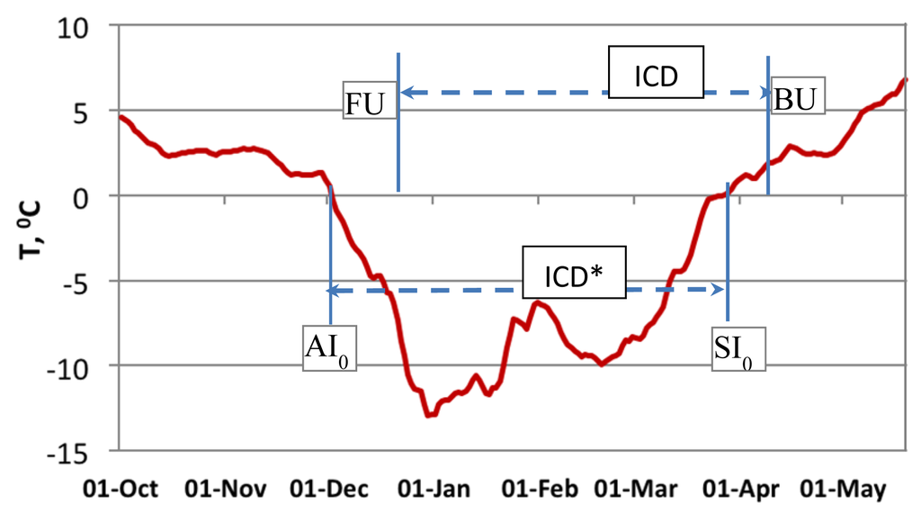 Air temperature is the single most important factor that influences the energy balance and ice cover regime in rivers and lakes. Changes in temperature derived indices, for example, autumn and spring 0 °C isotherm dates, annual accumulated freezing degree days (AFDD), and MWT can be used to infer the likely situation of the ice cover regime in the future. The advantage of using these indices is that they require only air temperature data that are readily available and are also reasonably predicted using GCMs and RCMs. Another advantage is that the indices provide useful proxy information for site-specific and regional studies that lack observational ice related data. Figure 2 provides a simplified illustration of the relationship between climatology indices and ice phenology dates.