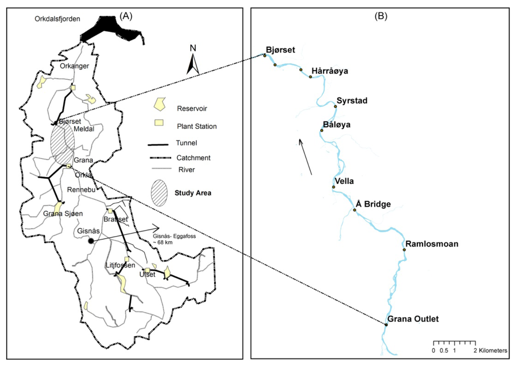 The Orkla River in central Norway (Figure 3) is the study site, and it is an example of a typical high-head hydropower system. The river system has been regulated with three reservoirs and five hydropower plants and a number of water transfers with secondary intakes. The Mike-Ice model was setup for the 40 km reach between the outlet of Brattset hydropower plant and the Bjørset dam. The analysis in this paper, however, is limited to the 20 km reach between the outlet of Grana power plant and Bjørset dam which by experience has the most severe ice. The outflow from Grana power plant enters the river in the middle of the study reach. The study reach has an average wetted width of 45 m, a mean slope of 0.23% and winter flows ranging from 15 m3/s to 55 m3/s (mean of ∼35 m3/s). Orkla has a long history of frazil production after the regulation, and intake clogging and frazil induced head losses are known to appear in the river.