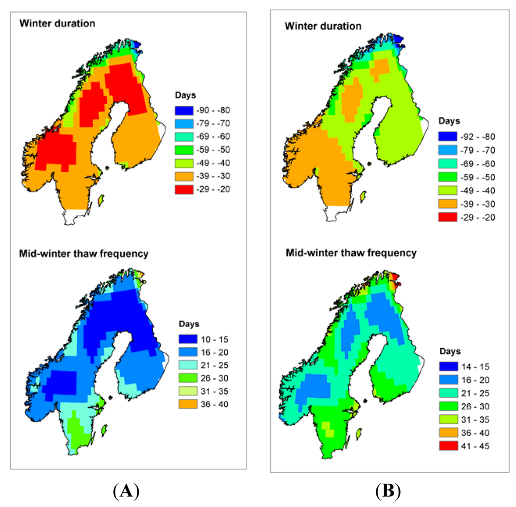 Warming of the climate system in recent decades is unequivocal [12]. This is evident from observations of increases in global average air and ocean temperatures, widespread melting of snow and ice, and rising global sea levels [13]. Climate has a key influence in winter hydrology including the ice regime. Factors that control the ice regime such as river flow and the heat exchange between water and the atmosphere are climate-controlled [14]. In the higher latitudes of the Northern Hemisphere, significant temperature trends have been observed in recent decades, with most pronounced changes occurring during winter and spring [15,16]. The changes in Fennoscandia averaged a decadal warming trend between 1961 and 2010 of 0.20 °C (autumn), 0.53 °C (winter) and 0.38 °C (spring) [15]. Concurrently, a number of other studies using historical observations of ice phenology (for lakes and rivers) have shown consistent evidence of later freezing and earlier breakup in the Northern Hemisphere [17–19]. Projections of future climate indicate that ice regimes (duration, extent and composition) will gradually change [15,20]. More frequent occurrence of mid-winter breakups and associated ice runs and jamming are changes that can be predicted as a result of warming of the climate system [20]. Mid-winter breakup events as a result of amplified winter warming may increase in the more temperate and maritime environments and also in the colder interior regions. Increased trends of mid-winter thaws (MWTs, >+1 °C) have also been observed in the Fennoscandia region [15]. Most studies relating to climate change impact have focussed on changes in water balance components such as precipitation, river flow and evapotranspiration [12,21]. Very limited studies exist that have used process based models to investigate changes in the ice regime of water systems (rivers, lakes and reservoirs). There is especially sparse literature on river studies. Large scale studies conducted on lakes project a general decrease in the ice cover duration and ice thickness due to changes in climate [22–25]. Few studies using detailed numerical modeling conducted on rivers also depicted reduction in the duration and extent of ice cover [26,27].