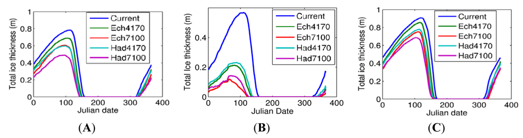 Considerable warming and change in precipitation patterns are predicted by General Circulation Models (GCMs) as a result of increased greenhouse gas concentrations in the atmosphere. Warming is projected to be greatest over land and at most high northern latitudes [12,13] and stronger during the winter time [28]. The pronounced warming during winter may imply shorter winter duration and hence shorter snow and ice season. In addition, there may also be changes in the seasonality of the river flow with more flow in winter and less in summer and spring. This is especially apparent as climate projections generally predict a trend towards higher precipitation in northern latitudes [21]. Due to the economic and ecological importance of freshwater ice, there is a growing need to forecast how global warming will influence the freshwater ice dynamics in cold regions [29,30]. The general impact of climate warming in the future is to delay freeze-up, advance break-up and thereby have a shorter ice season [31]. But, the detailed effects of a changed ice dynamics within a shortened ice season is less clear. A shorter ice season may imply economic savings to hydropower facilities, whereas more frequent mid-winter break-ups may lead to increased frazil production [31], and hence more frequent problems in a shorter season. Detailed quantitative predictions using process-based numerical models will provide better insight into future ice conditions under a changed climate.