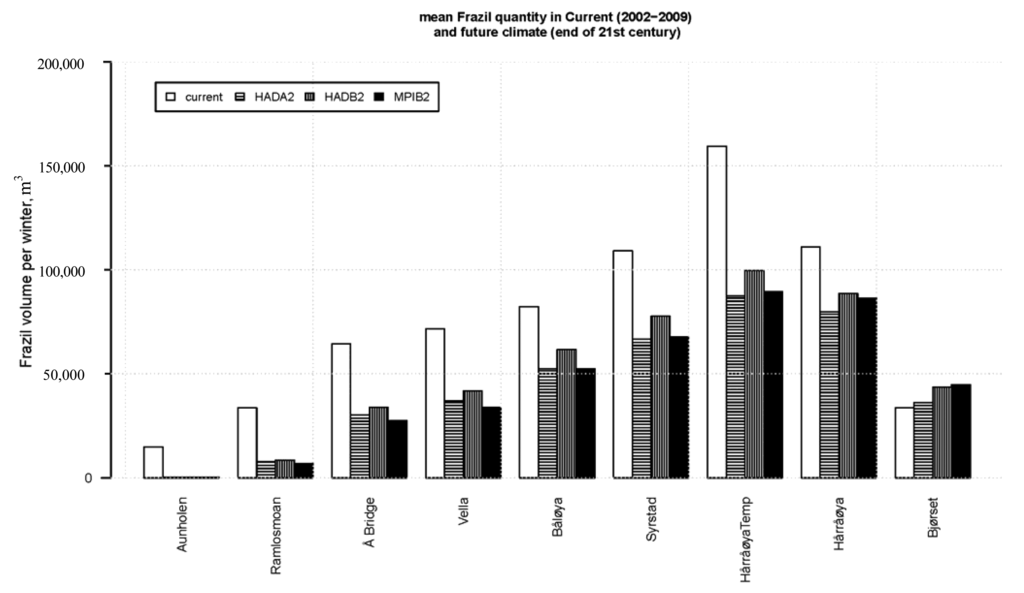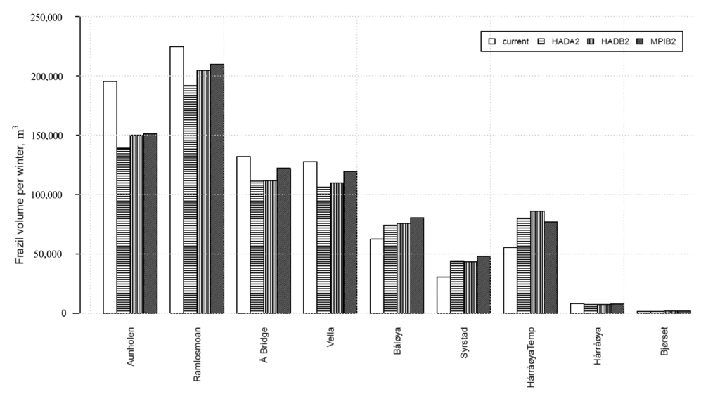 In all three future climate scenarios, the volume of frazil production is considerably reduced in all cross sections except the intake pond at Bjørset where we see a slight increase in the future. This reduction may be attributed to an increase in winter flow and increased water temperature in the future climate. The increased frazil production at Bjørset intake can be explained by a reduced duration of ice cover and hence a higher chance for generation and transport of frazil. A minimal variability between scenarios is observed.