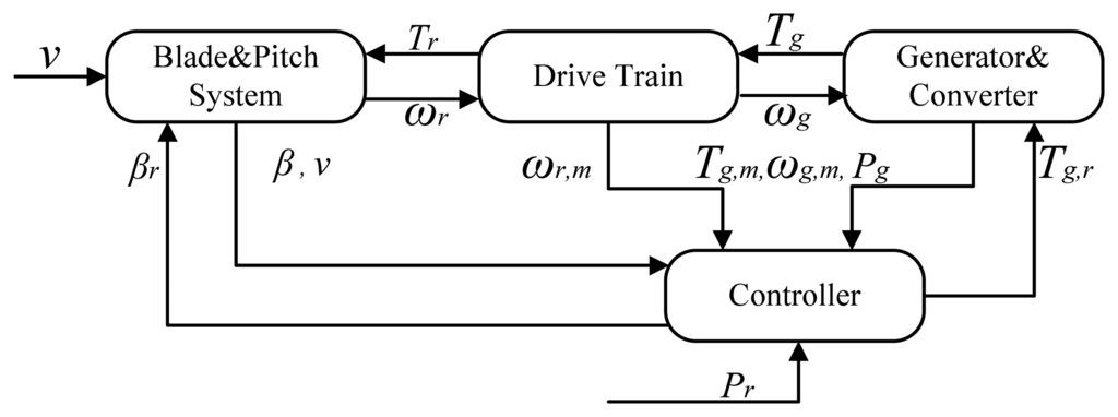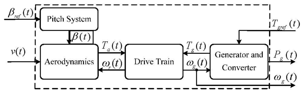 The structure of a WECS is described as Figure 1, in which the WECS inputs are wind speed ν(t), pitch angle reference βref(t) and generator torque reference Tgref(t), respectively. The outputs of the system are generator power Pg(t) and high-speed shaft speed ωg(t).