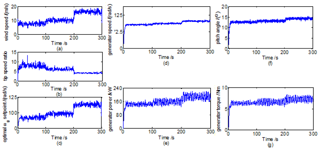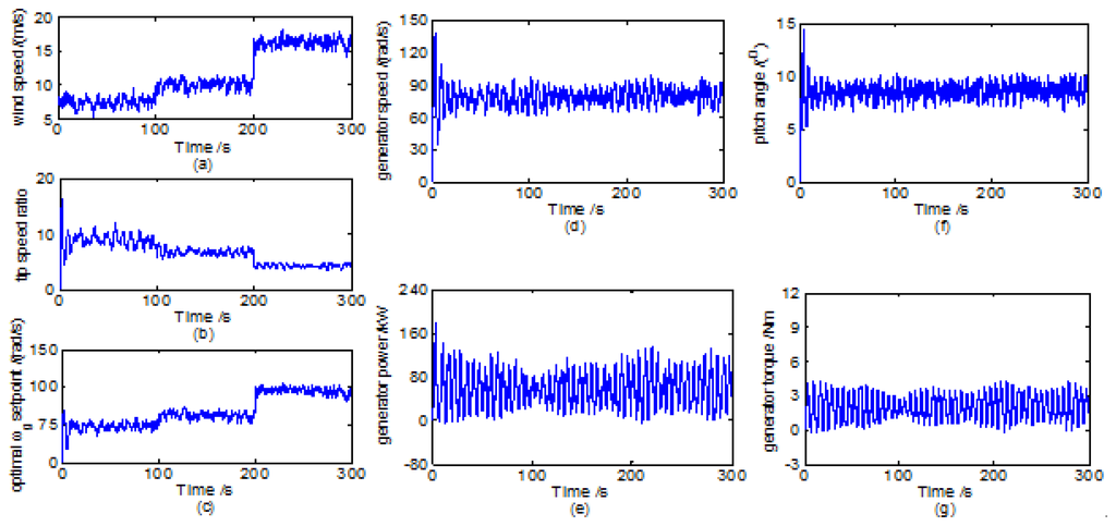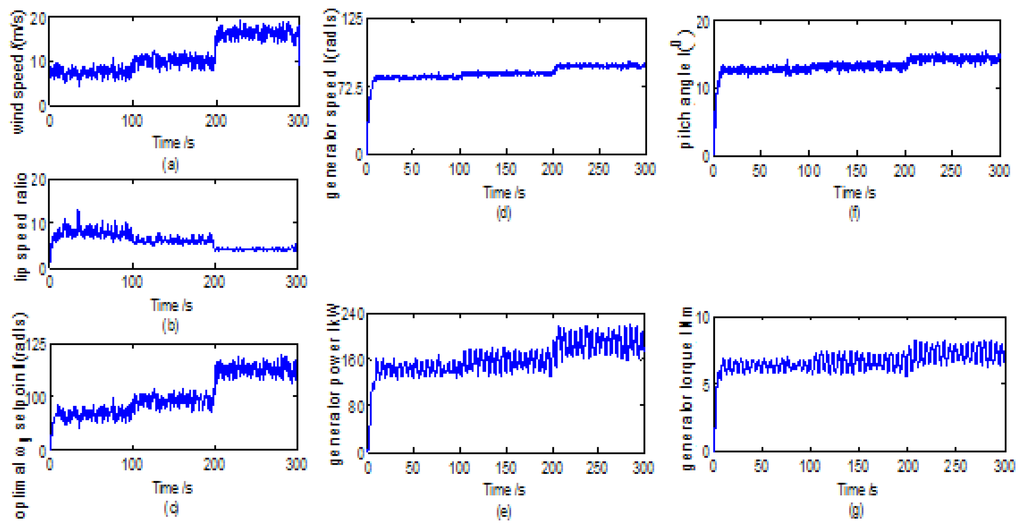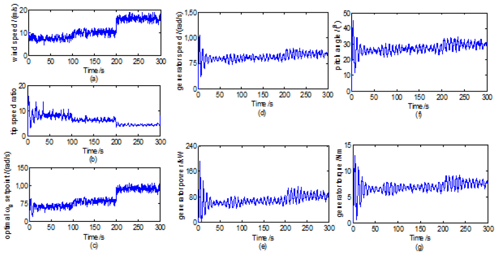 The generator speed and generator power responses are shown in Figure 5d,e, from which we can conclude the real generator power tracks the optimal set point quite well and the generator speed is controlled with good performance. Figure 5f,g give the H∞ controller output of pitch angle β and generator torque Tg. Figure 5 show the H∞ controller of WECS designed based on stochastic PWA model combining with MPPT module works quite well.