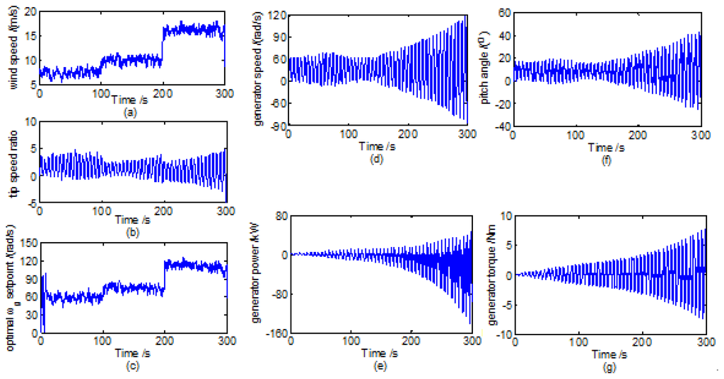 However, comparing with Figure 5d,e, the performance of generator power Pgf and generator speed ωgf have deteriorated, and begin to show the trend of losing stability. The control variables display wide range oscillations in Figure 6f,g. It is seen that the normal H∞ controller for WECS cannot deal with the actuators fault with gain factor loss Γa. Comparing Figure 6d,e, Figure 7d,e demonstrate the response of generator speed and generator power under the control of H∞ fault tolerant controller designed based on Theorem1 based on the stochastic PWA actuator fault model of WECS, from which we can see that the performance with fault tolerant design significantly is better than the normal controller.
