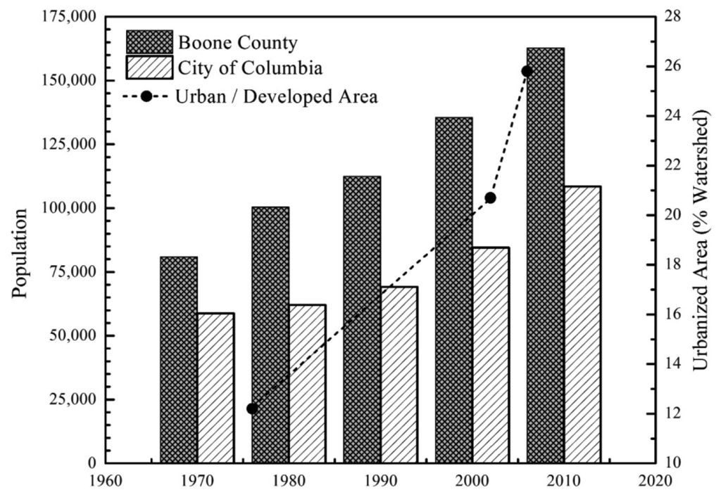 This study took place in the Hinkson Creek Watershed located in central Missouri, USA. The Hinkson Creek Watershed (HCW) includes more than 60% of the city of Columbia (population approximately 108,000) [24], and contains commercial, urban, and residential areas consisting predominately of impervious and high to low density urbanized areas [25]. The HCW is a representative urban watershed given its growing residential composition with progressive commercial expansion. Figure 1 shows a population growth trend that is very similar to other mid-sized cities in the Midwest US, and elsewhere. Land use in the watershed is approximately 25.8% forest, 49.8% cropland/grassland, and 15.8% urban area (Table 1).