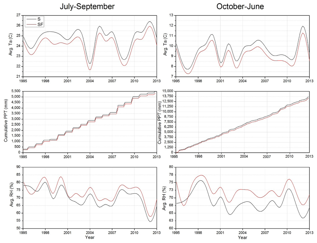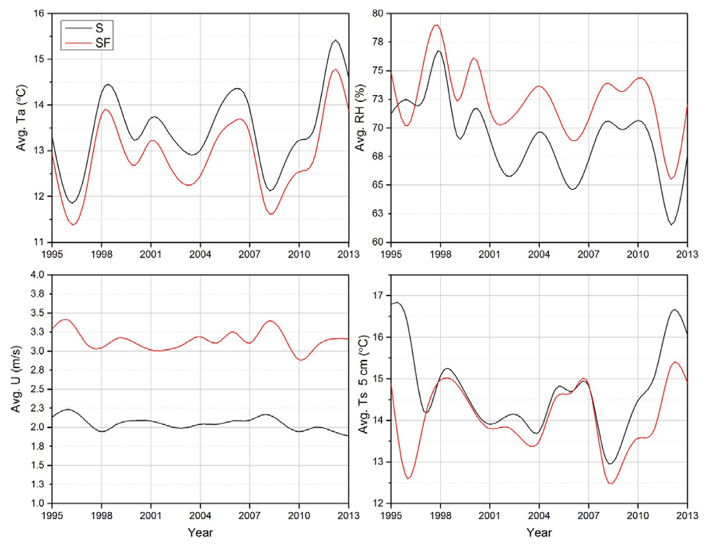 Climate analyses from Sanborn and South Farm monitoring sites exhibited distinct contrasts during the study period (Table 3). One-Way ANOVA results of hourly time series data indicated significant differences between the two sites (p < 0.001) for every climate variable except precipitation (p > 0.34) and average incoming solar radiation (p > 0.23). The statistical similarity of precipitation at the two sites is likely a result of the strong right-skewness of precipitation data. Precipitation data in the central US often demonstrate right-skewness since precipitation events are infrequent and variable. When zero values (no measurable precipitation) were removed from the data set, precipitation data exhibited similar patterns of right-skewness. After zero value removal, ANOVA results still indicated a lack of significant trend (p = 0.06) between the two sites. Notably, hourly time-series indicated 46 more precipitation events at Sanborn relative to South Farm during the study period. This supports the hypothesis that the UHI effect can lead to increased convective storm activity in urban environments. Although the difference in precipitation at the two sites was not statistically significant, statistical non-significance of climate data should not be assumed to be ecologically benign. The similarity of incoming shortwave solar radiation is reasonable considering the relatively close geographical proximity and topographical similarity (i.e., no prominent surrounding hills or landforms) of the two monitoring sites. During the 19 year study period, Sanborn was consistently warmer (average = 0.58 °C) and less humid (3.40%) than South Farm (Figure 4). This result is in agreement with numerous previous studies dating back to the work of Howard [5], and including that of Unger et al. in 2001 [8]. Howard was the first to catalog an air temperature gradient between rural and urban sites, but his work was limited to air temperature as a measure of the rural versus urban climate gradient [5]. Unger et al. analyzed air temperature variation at rural and urban sites near Szeged, Hungary, and described isolines corresponding to the urban land use intensity throughout their study area, with the highest temperatures being found in the center of the city [8]. The air temperature gradient identified in the present study is in agreement with Lupo et al. [30] who used twenty temperature sensors distributed throughout the greater Columbia, Missouri area as well as data from established climate stations over a period of one year, and noted a temperature gradient that correlated land use intensity with highest temperatures near the city center and a highly developed suburban area south of the city [30]. Ensuing work by Buckley et al. [17] helped to establish a limit on the areal influence of the UHI effect that was reported in the Lupo et al. [30] study. The urban versus rural relative humidity gradient in the present study, with a 3.40% lower relative humidity at the urban site, is in agreement with the negative correlation with the UHI effect identified by Papanastiou and Kittas in 2009 [9]. It is worth acknowledging that the absolute difference between average temperatures of the sites (0.58 °C) was near the accuracy of the air temperature sensor used (0.5 °C). Therefore, the difference between the sites, while significant (p < 0.05), should also be considered within the context of sensor accuracy. It is also worth noting that the Sanborn site lies in the middle of an inner city field often used for small scale agricultural crops (corn, soybeans, grass) by University of Missouri researchers. On this basis some UHI variables such as air temperature could be attenuated, and underestimated at certain times, and thus more similar to the South Farm site. Normally, relative humidity in urban areas is generally decreased as a result of reduction in vegetated cover and antecedent soil moisture conditions in combination with increased air temperature and surface heating [1].