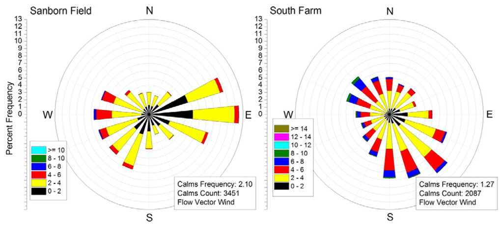 In the current work, the variable exhibiting the greatest difference between the two sites was average wind speed, which was more than 50% greater at South Farm (rural site). Conceivably, higher wind speeds could result in precipitation gauge undercatch at South Farm. Precipitation gauges were not shielded at either site. Therefore, and though speculative, observed precipitation differences in the current work may be underreported, and could be even greater if gauges were properly shielded. Lower wind speeds at the Sanborn Field site are presumably the result of greater surface complexity (i.e., buildings and structures) and the interruption of wind currents by buildings in the vicinity of the Sanborn site. Obstruction, diffusion, and redirection of turbulence by the greater urban surface roughness likely results in lower average wind speeds at the site. The observed wind speed gradient noted in the current work is corroborated in previous studies. In 2012, Papanastasiou and Kittas reported that wind speed was negatively correlated with the intensity of urban land use [9]. Ryu and Baik confirmed this relationship in 2012, showing that the urban geometry of buildings was a causative factor of urban wind speed reduction [18]. Ryu and Baik also showed a positive correlation between reduced wind speed in the urban environment and reduced daytime heat island intensity [18]. Figure 5 illustrates average wind direction at both sites. Analysis showed wind direction at both sites to be, on average, of southerly origin (Table 3). It is arguable that average wind direction data should indicate southerly direction regardless of geographic location. Therefore, to better characterize wind direction variability between Sanborn Field and South Farm, U (east-west direction) and V (south-north direction) wind components were calculated as per the methods of Stull [31]. For U average, minimum, maximum and standard deviation were 0.145°, −7.772°, 9.023° and 1.93° for the Sanborn site and 0.159°, −9.372°, 12.486°, and 2.391° for the South Farm site. For V, average, minimum, maximum and standard deviation were 0.141°, −4.999°, 6.395° and 1.277° for the Sanborn site and 0.376°, −10.970°, 10.973°, and 2.646° for the South Farm site. Using this method, average wind direction was estimated to be 225.8° for Sanborn and 202.9° for South Farm. These results further illustrate the disturbance of wind speed and direction in the urban environment, presumably attributable to presence of buildings and generally altered surface roughness.