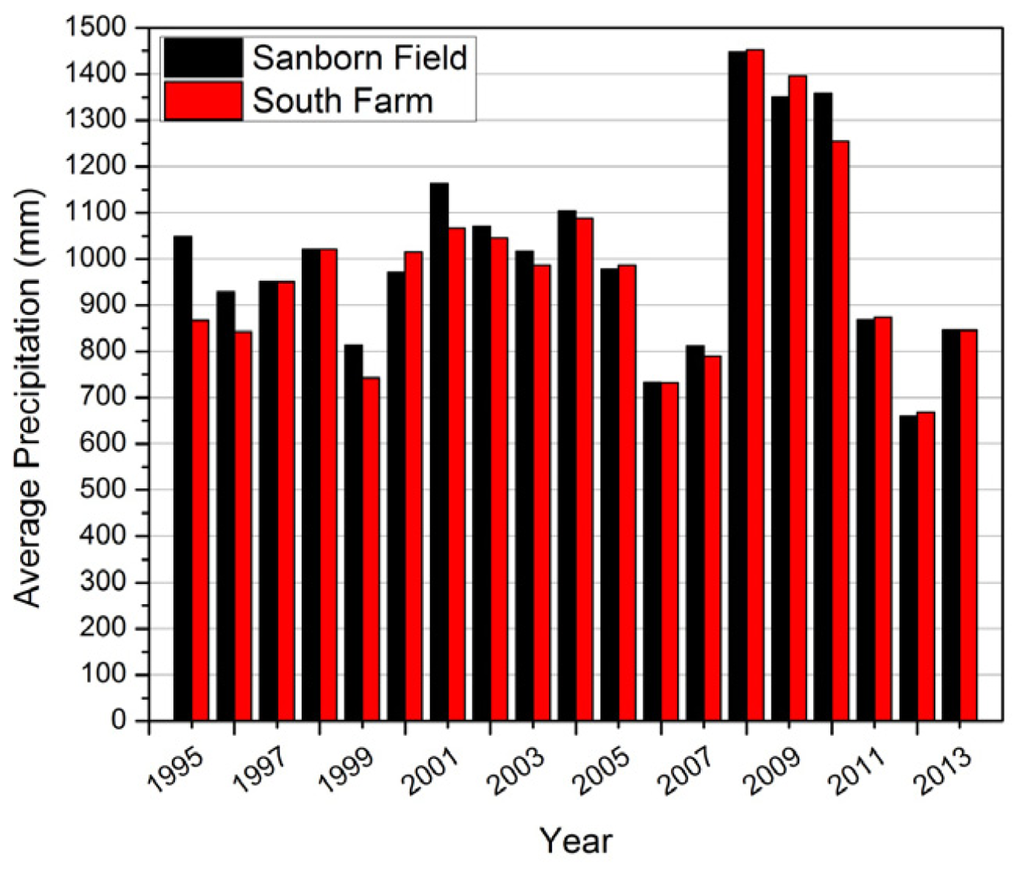 Over the course of the present study, the Sanborn Field site received 510 mm more precipitation than South Farm (Figure 6) indicating a long term trend of greater precipitation at the more urbanized site (i.e., Sanborn). Bornstein and Lin reported an increased likelihood of thunderstorms arising at convergence zones between urban and rural land use types [15]. They also showed that moving thunderstorms can bifurcate and pass around urbanized areas [15]. The data in the current study indicate that Columbia, Missouri falls more generally into the first category, perhaps due to the fact that Columbia is a mid-sized city. A third possible mechanism for an urban influence on precipitation includes destabilization due to the UHI [7]. While it is difficult to generalize the aerosol effect on precipitation across seasons and atmospheric conditions, increased aerosol concentrations lead to decreased precipitation in stratocumulus clouds, small cumulus clouds, orographic clouds, cold-based convective clouds, and dry environment deep convective clouds [33,34]. Increased aerosol concentrations lead to increased precipitation in warm-based deep convective clouds, convective cloud ensembles and squall lines in moist environments [33,34]. With seasonal transition from summer to winter in Missouri, the portion of precipitation from stratocumulus and cold-based convective clouds increases while the portion of precipitation from warm-based deep convective clouds decreases. Furthermore, during winter a physical mechanism for aerosol transport to cloud level may generally be lacking due to less frequent convection and the absence of orographic influences. Therefore, although increased aerosol concentrations from an urban area can lead to both increases and decreases in precipitation, one would expect an aerosol effect on precipitation in Columbia, if discernable, to be that of increased precipitation during the warmer months within and downwind of the urban area.