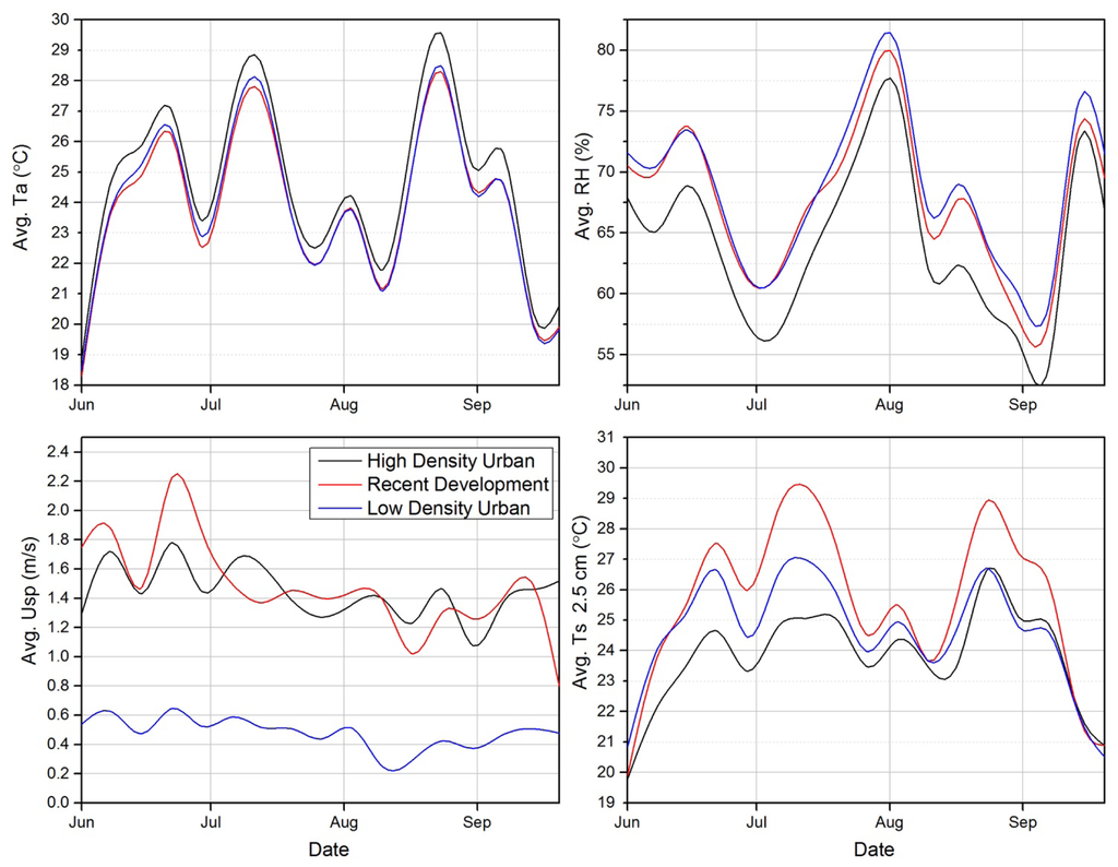 Results from analysis of the UHI intra-urban gradient study sites indicate a distinct impact of increasing urban development on microclimate (Table 5, Figure 8), thus greatly supporting the hypothesis explaining the rural to urban gradient stated earlier. Results of One-Way ANOVA showed significant differences (p < 0.001) between the three sites for every variable except precipitation (p > 0.97). Tukey post hoc tests, which compare individual sites to one another, showed that for each significantly different variable except air temperature and wind direction, each site was significantly different (p < 0.05) from other sites. For air temperature and wind direction, the low density urban and recent development sites were not statistically significantly different. Average air temperatures were 23.69, 23.78, and 24.49 °C for the recently developed, low density urban, and high density urban sites, respectively. Previous studies such as that of Hart and Sailor suggested a gradient of air temperature from rural to increasingly more urbanized areas where the lowest temperatures occur in the rural area, increasing to a maximum near the city center [2]. Heterogeneity within this general pattern can occur as a function of the number of roads (i.e., increased impervious surface; increased air temperature), or vegetated areas in the city such as parks (i.e., decreased impervious surface; decreased temperature). Montávez et al. discussed a similar gradient in urban temperatures which increased with proximity to the city center in Granada, Spain [10]. The higher temperatures at the high density site in the current study are consistent with observations from previous studies. Relative humidity percent differences were 1.54%, 5.46%, and 7.08% for low density vs. recently developed, recently developed vs. high density, and high density vs. low density, respectively, with relative humidity decreasing as land use intensity increases. Similarly, Papanastiou and Kittas noted a negative correlation between relative humidity and land use intensity in winter (correlation coefficient −0.31), but found a weaker positive correlation in summer (correlation coefficient 0.17) [9]. The large difference in average wind speed at the low density urban site (approximately double) relative to the other sites is likely a result of increased turbulence and dissipation of kinetic energy by trees, buildings and fences located near the sensor. Analysis of net radiation showed significant (p < 0.001) differences between the three sites. The low density urban site had the lowest average net radiation (60.12 W/m2); the recently developed site had the highest value (141.61 W/m2). These results reflect differences in surface cover including presence and density of trees and grass (low density urban site), or asphalt and concrete (high density urban site). Zell and Hubbart suggested that a surface energy balance approach could be used to quantitatively assess ecosystem stability [35]. It was proposed that ecosystem stability is approached when all energy requirements are met or the net energy flux is always negligibly positive (i.e., net exergy) [35]. The results of the current work support the work of Zell and Hubbart in that the high density urban and the recently developed site had much higher net radiation relative to the low density site that was characterized by more trees and green spaces, and thus could be arguably more ecologically stable. Future work should investigate the usefulness of the surface energy balance ecosystem stability approach to target urban areas for conservation activities (e.g., urban forests) that may offset the UHI effect.