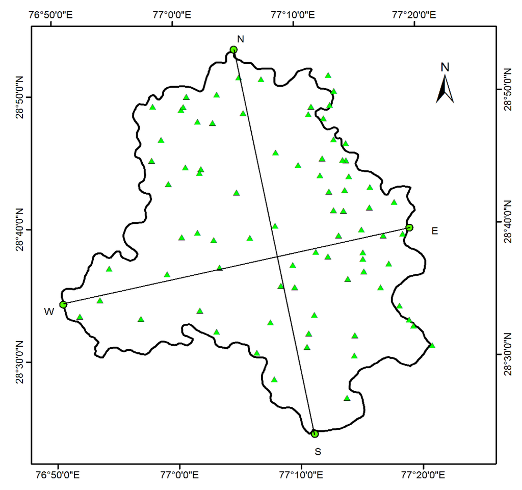 These three steps were repeated for all the four images. The temperature in Celsius scale ranged from 10.4 °C to 48 °C, which was classified in 19 classes at 2° class intervals. In order to establish the relationship between LST and corresponding land use/cover type, 80 sample points were selected randomly from different land use/cover types in the study area (Figure 3). About 11–13 samples were selected from each land use/cover types, e.g., urban and rural built-up land, agriculture, lakes and the Yamuna River, vegetations and sand bars. The thermal characteristics of these 80 locations are studied across the seasons. The average temperature of each land use/cover category for each season was calculated using the formula of simple arithmetic mean. The range of temperature was also estimated by calculating the difference of highest and lowest temperature of respective land use/cover in each season and for summers and winters. Further, to investigate on the spatial pattern of LST, west-east and north-south profiles have been plotted in Delhi for all the four seasons (Figure 3). The north-south profile covered 1826 pixels, whereas the west-east profile covered 1590 pixels. The major land use/cover types were plotted on x axis and surface temperature on y axis to effectively represent their spatial relationships.