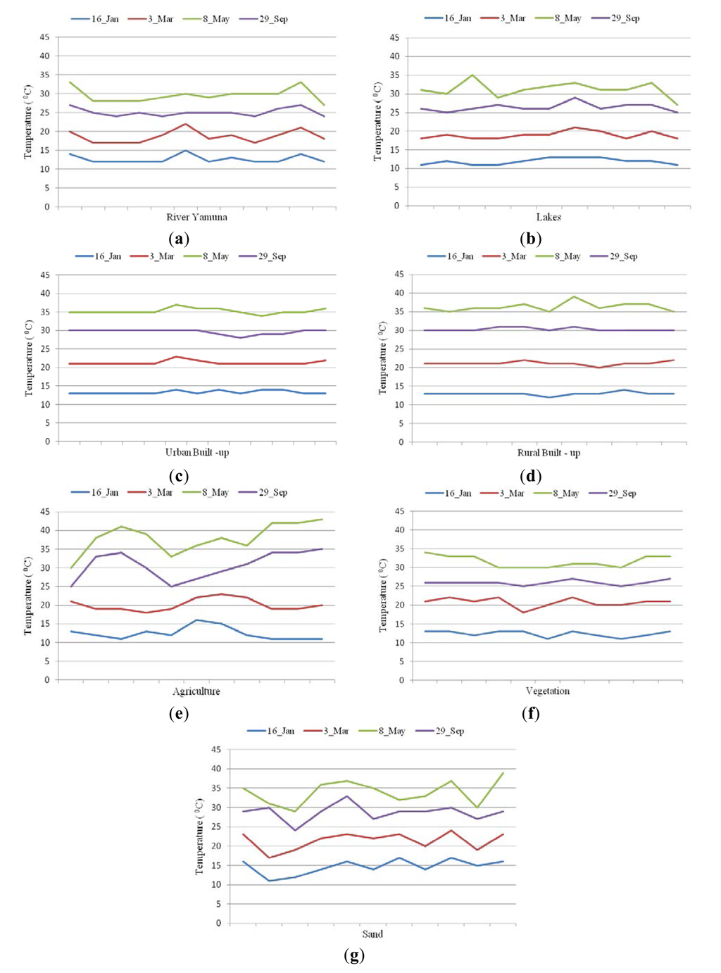 On the basis of analysis of 80 samples points selected for all the four seasons, it is found that the overall average surface temperature is lowest in January and highest in May. The March and September observe moderate temperature; however the average temperature of September is more than that of March (Table 3). In winters, the lowest average temperature is observed for agriculture, lakes and vegetation cover; the moderate temperature for urban and rural built-up area, the Yamuna River and highest temperature for sand bars along the river. In spring, a relatively higher average temperature is recorded for all land use/cover categories. The analysis of average temperature of summer season reveals significant variations across the land use/cover categories. The highest average temperature is observed in agricultural and rural built-up land, i.e., 38 °C and 36 °C, respectively. Urban built-up and sand bars along the Yamuna River indicate relatively lower temperatures, i.e., 34 °C and 35 °C. The lowest temperature is recorded for vegetation, lakes and the Yamuna River (30–32 °C). In the autumn, a relatively lower average temperature is recorded for all the land use/cover types as compared to summers; however the spatial pattern remains unchanged.