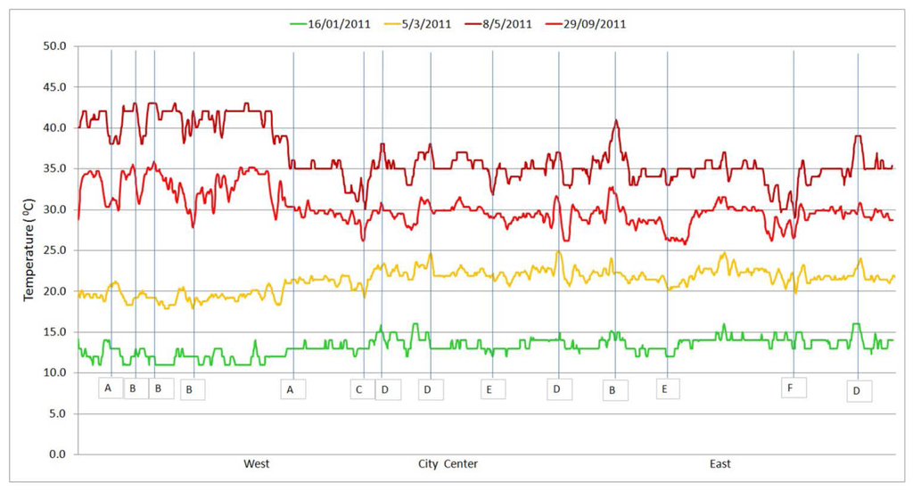 The north-south and west-east profiling of surface temperature across Delhi was also attempted in order to find out the minor spatial differences of surface temperature and to further identify the UHIs in Delhi. On the x axis, the land use/cover types have been mentioned for major peaks and troughs in the temperature profiles representing different seasons. In the north-south (Figure 6) and west-east (Figure 7) temperature profiles, a total of 1826 and 1590 pixels, respectively, were taken into consideration for the purpose. In general, there should be higher temperatures in the city core (built-up land) in comparison to the periphery dominated by agriculture, vegetation and rural areas as suggested by Zhang and Wang [7] based on ten cities in Guangdong Province of China. Such surface temperature conditions have been confirmed by Chen et al. [16] in case of the Pearl River Delta, Li et al. [52], Jiang and Tian [53] and Ding and Shi [22] for Shanghai. However, Delhi does not possess this pattern of surface temperature that is in contrast to the general understanding of UHIs (Figures 6 and 7). The built-up areas in central Delhi do not indicate highest temperature conditions. Instead the agricultural areas, which are left fallow in the summer season, possess the highest temperatures.