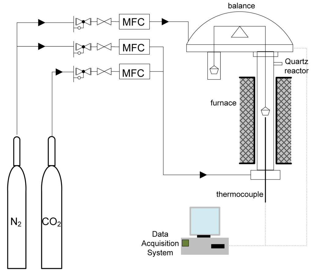 The carbonation behavior of the samples was measured using a Cahn-131 thermogravimetric analyser (TGA) (Thermo Fisher Scientific, Newington, NH, USA) at five different temperatures in the range of 550–750 °C. The schematic diagram of the experimental setup is shown in Figure 1. In each run about 20 mg sorbent was loaded into a quartz holder hanging from the balance on a platinum wire that passes through the inside pipe of the cooling section. The furnace was then heated up to 900 °C at a ramp rate of 20 °C/min in a pure N2 stream with volumetric flow rate of 85 mL/min. After 10 min holding at 900 °C, the furnace was cooled down to the desired temperature for carbonation under 15 vol% CO2 (N2 balance) for 30 min. A thermocouple was placed about 5 mm below the sample hold to represent the solid temperature. The mass of the sample was recorded by the balance every 10 s.