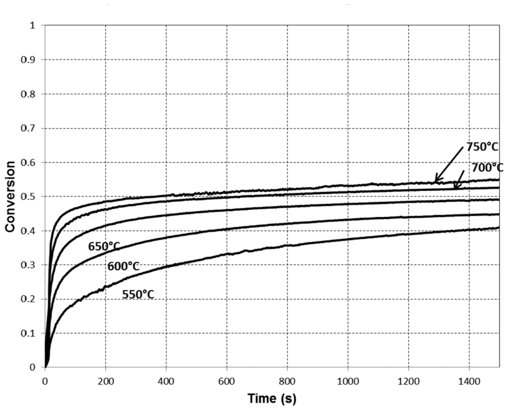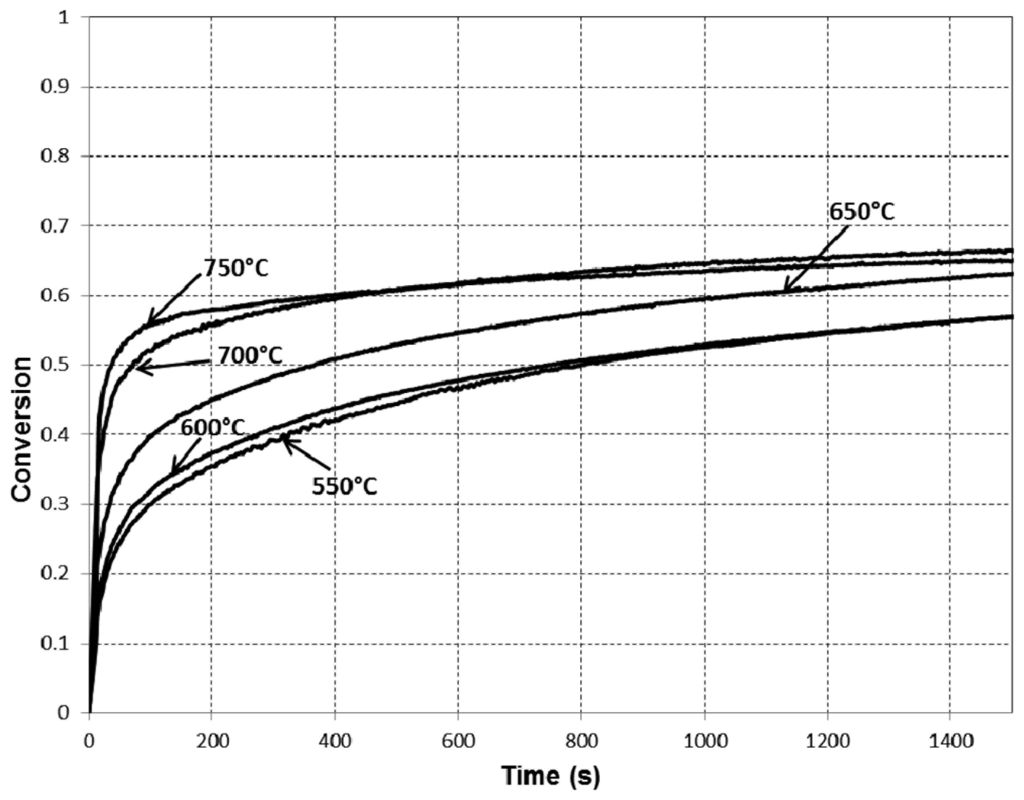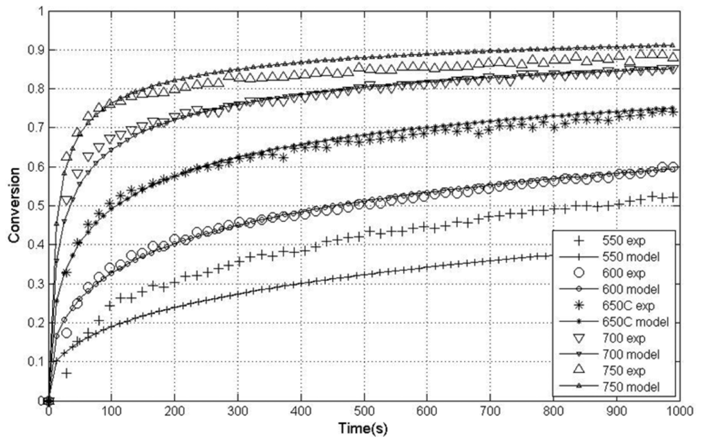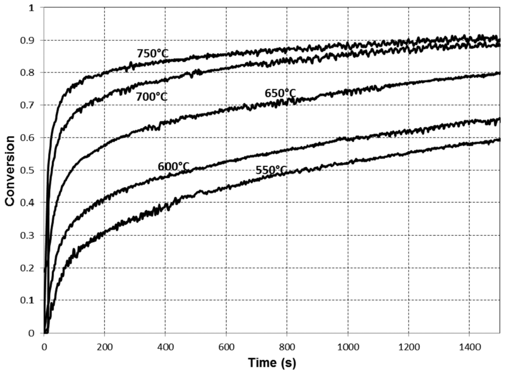 The results of the modeling and their comparison with experimental data are presented in Figure 5. Figure 5 shows that, except for the lowest temperature of 550 °C, very good agreement of the model prediction with the experimental data has been achieved. In this work, we followed [14] and utilise the Arrhenius equation with a constant pre-exponential factor to describe the dependence of the product layer diffusivity on temperature. In reality, however, this dependence can be more complex. According to Figure 9 in [14], the Arrhenius-type dependence of the diffusivity on temperature has been reported only for high temperatures (more than 850 °C), while the behavior of the diffusivity in the lower temperature region remains unclear. It is reasonable to assume that one should use the modified Arrhenius equation (with a temperature-dependent pre-exponential factor) to describe the product layer diffusivity for lower temperatures. Therefore, the discrepancy between the model predictions and experimental data observed for the temperature of 550 °C can be explained by the use of a simplified equation for product layer diffusivity.