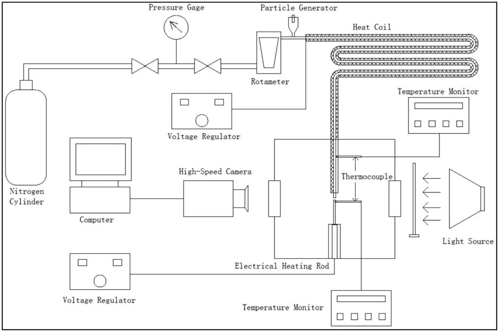 Despite the above developments on the impact problems of particles with a substrate, there are still many important issues that remain unsolved. For example, the effects of the temperatures of particle and substrate on the rebound characteristic of particles need to be investigated by either experimental analysis or more detailed theoretical analysis. Therefore, the present work provides a basis for investigating the rebound behavior of fine particles impacting normally on a flat substrate at temperatures within a range. An experimental set-up was developed to study the normal impact of particles with a plane surface and was described in Section 2. The experimental results under four conditions are given in Section 3. The experimental results are compared to the theoretical analysis and discussed in Section 4. Conclusions are given in Section 5.