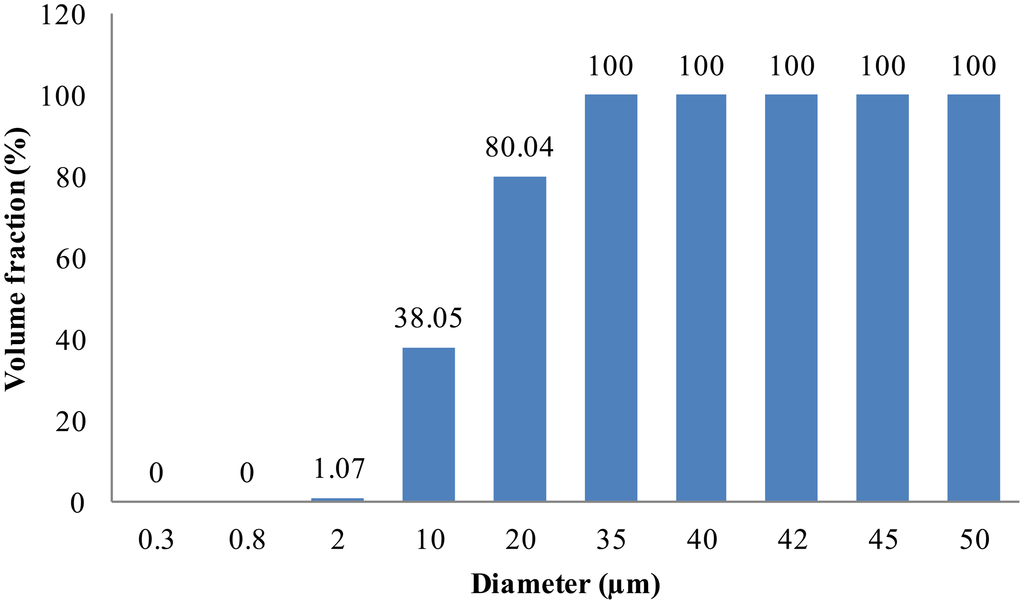 The volume particle diameter distribution is obtained by Laser Particle Size Analyzer (Mastersizer 2000, Malvern Instruments Ltd., Malvern, UK). The volume particle diameter distribution is shown in Figure 4. Thirty-eight percent of the volume particle diameter is smaller than 10 μm, eighty percent is smaller 20 μm, hundred percent is smaller 35 μm. Before carrying out an experiment, the particles were stored in a stove at 80 °C to minimize agglomeration problems.