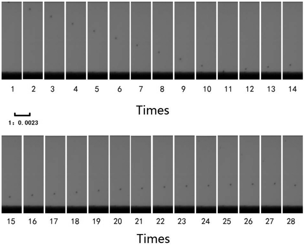 The course of the impact is recorded using a digital high-speed camera (Phantom V12.1). The max frame rate is 150,000 frames/s, corresponding exposure time is 5.93 μs, and corresponding pixel is 256 × 128. The minimum frame rate is 58,000 frames/s, corresponding exposure time is 15.77 μs, and corresponding pixel is 256 × 256. To determine the impact and rebound velocities accurately, the camera is equipped with an optical lens (VS-M0910). To track an incident and a rebound particle passing through this domain, a fiber optic solar light source (XD-300 xenon lamp) was used to backlight the particle impact events. An example of a recorded image with a resolution of 256 × 128 is given in Figure 5. In order to reduce the effect of the particle shape and the fluid drag force on the accuracy of the velocity measurements, incident velocities are determined from the distance of successive blobs 10–11 in Figure 5, and rebound velocities are determined from the distance of successive blobs 11–12 in Figure 5.