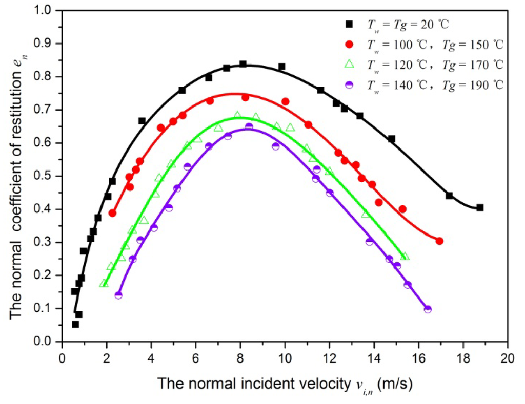 Experimental results indicate that the impact with normal incident velocity lower than the critical velocity leads to a final capture (en = 0). For normal incident velocity larger than but close to the critical velocity, the en ∼ vi,n curve has a steep increase. However, its slope rapidly decreases as the normal incident velocity increases further, and the normal coefficient of restitution rapidly decreases with increasing normal incident velocity. Clearly, carrier gas temperature and impaction surface temperature have a great influence on the particle-surface collision process.