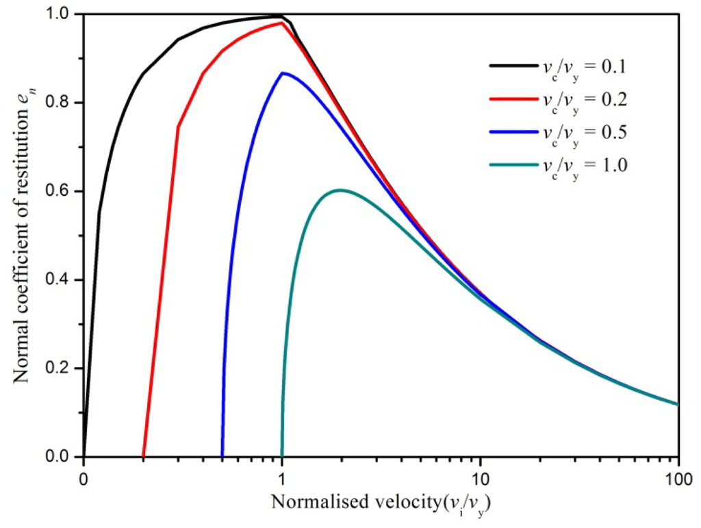 Thomton and Ning [33] derived an analytical model for the coefficient of restitution e which is expressed in terms of the incident particle velocity vi, critical capture velocity vc (here vc = vs) and the yield velocity vy. The model considers the normal impact of elastic-perfectly plastic spheres with interface adhesion. The normal coefficient of restitution en as given by Thornton and Ning is equal to:
