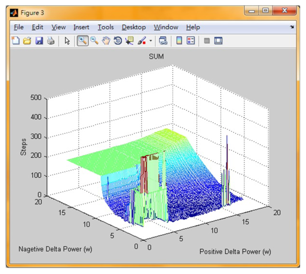 In Section 3, the design procedures of the proposed symmetrical FLC have been explained. To further improve the performance of the proposed FLC, the derivation of asymmetrical input MF technique will be explained. Figure 9 shows the dP/dV vs. duty cycle curve, which can be obtained by dividing Figure 7b with Figure 7a. Observing Figure 9, the dP/dV curve of a solar cell has different slopes on two sides. That is, when operating point locates at the left-hand/right-hand side of the MPP, the generated power variation will be larger/smaller under a fixed duty cycle variation. Thus, when designing the UOD of input variable ΔPpv, it is essential to take this phenomenon into consideration. To deal with this issue, a variety of artificial intelligent (AI) methods have been proposed in the literatures to obtain the optimal configuration of the MFs. These AI methods include GA, PSO and Hopfield ANN [15–17,24]. According to the experimental results, these AI approaches can acquire the optimal configuration in most cases. However, the problem of using AI techniques is that the parameters of these algorithms (for example, the population size, rate of crossover and rate of mutation in GA or the inertia factor, social rate and cognitive rate in PSO) are hard to determine. On the other hand, it can be observed that the UOD of ΔPpv has relatively larger impact on the proposed FLC-based MPPT controller, which implies that the problem complexity can be reduced if only the ΔPpv optimization is taken into account. Therefore, grid search technique is employed in this paper to obtain the optimal design of the UOD of ΔPpv Figure 10 shows the implementation concept of the grid search method used in this paper. First, this study fixed the dP_PB value at POSmax/100 W (referring to Figure 10, POSmax = 2 × dPmax in this paper), and the dP_NB value was gradually reduced from NEGmax/100 W to NEGmax W (NEGmax = −1 × POSmax) through a fixed increment of NEGmax/100, yielding a total of 100 points. Subsequently, the dP_PB value was increased to 2 × POSmax/100 W through a fixed increment of POSmax/100; with this new value, the previous procedure, in which the dP_NB value experienced a 100 point decrease, was repeated. This process was repeated until the dP_PB value is equal to POSmax W. This test method produced 10,000 (100 × 100) combinations of simulation test points. Then, according to these possible UOD combinations, simulation is conducted under a step change in solar irradiation from 0 to 1000 W/m2 for the proposed system. The steady-state tracking time can then be observed in a 3D plot in which the z-axis represents the numbers of tracking steps. Consequently, it can be concluded that the point with the lowest z-axis value indicates the optimal UOD combination. To reduce the complexity for optimization, the shape of the ΔPpv MF remains as triangle shape and the ratio of large value to small value remains as 2 to 1 (that is, dP_NS = (dP_NB/2); dP_PS = (dP_PB/2)). Additionally, to take every tracking situation into account, the simulation is carried out using two initial conditions—initial duty cycle value equals to 10% (representing the tracking from right to left along the P-V curve) and 90% (representing the tracking from left to right along the P-V curve). Then, the tracking time required for both cases is summed up as the total tracking time. Figure 11 shows the obtained 3D simulation result under different UOD configurations. The obtained optimal results are dP_PB = 7 W and dP_NB = −2.5 W.