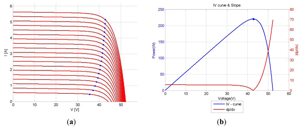 Figure 4a shows the I-V curves of the utilized Sanyo VBHN220AA01 solar panel under different irradiation levels, these curves are obtained using MATLAB simulation. The circular markers in the graph represent the calculated maximum power points. The corresponding P-V curve for 1000 W/m2 irradiation level is given in Figure 4b. Observing Figure 4b, the absolute value of dP/dV of a PV panel varies smoothly and is recommended in [10] as a suitable parameter for determining the step size of the IncCon algorithm. Thus, power variation (ΔPpv) and voltage variation (ΔVpv) from solar cell are also used as the inputs of the proposed FLC-based MPPT controller.