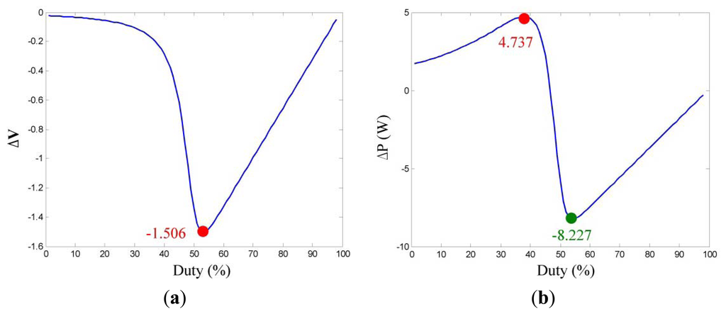 With a 1% step size, a profile can be plotted by increasing duty cycle from 0% to 100% with x-axis represents duty cycle and y-axis represents voltage variation or power variation, as shown in Figure 7. In Figure 7, the simulation is conducted under the standard test condition (1000 W/m2, 25 °C). From Figure 7a, the maximum value of ΔV/ΔD will be utilized to determine the UOD of ΔVpv (denoted as dVmax). Likewise, the UOD of ΔPpv (denoted as dPmax) can be determined in similar ways. In this paper, dVmax is 1.5 V and dPmax is 8.2 W.