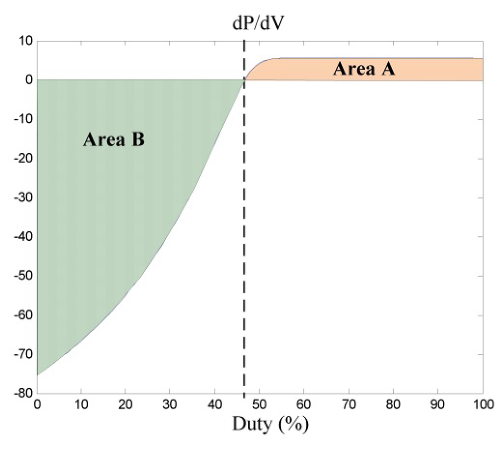 Because grid search method is capable of searching every possible region and its generated 3D surface is a smooth surface; therefore, the proposed grid search method can yield optimal results. However, grid search method requires large amount of simulations (20,000 simulations in this case), thus increases the complexity of design. Consequently, a simple design method which can be used to determine the UOD of the MF of ΔPpv is also proposed in this paper. It can also be observed from Figure 9 that the dP/dV values of fixed duty cycle variation on two sides of the MPP are not identical. After conducting integration for the dP/dV curves on both sides of MPP, the area under the curve on the left (area B) was 2093, the area under the curve on the right (area A) was 278, and the ratio of area B to area A was 7.53. Therefore, if the MF of ΔVpv remains unchanged, the asymmetrical UOD problem can be adequately addressed by setting the ratio dP_PB and dP_NB as 7.53 (i.e., dP_PB = 8.2 and dP_NB = −1.1). Although this method cannot guarantee to obtain the optimal solution, it can efficiently determine the configuration of the UOD of ΔPpv with quite satisfactory performance. Experimental results for these two methods will be provided in Section 5 for comparison.