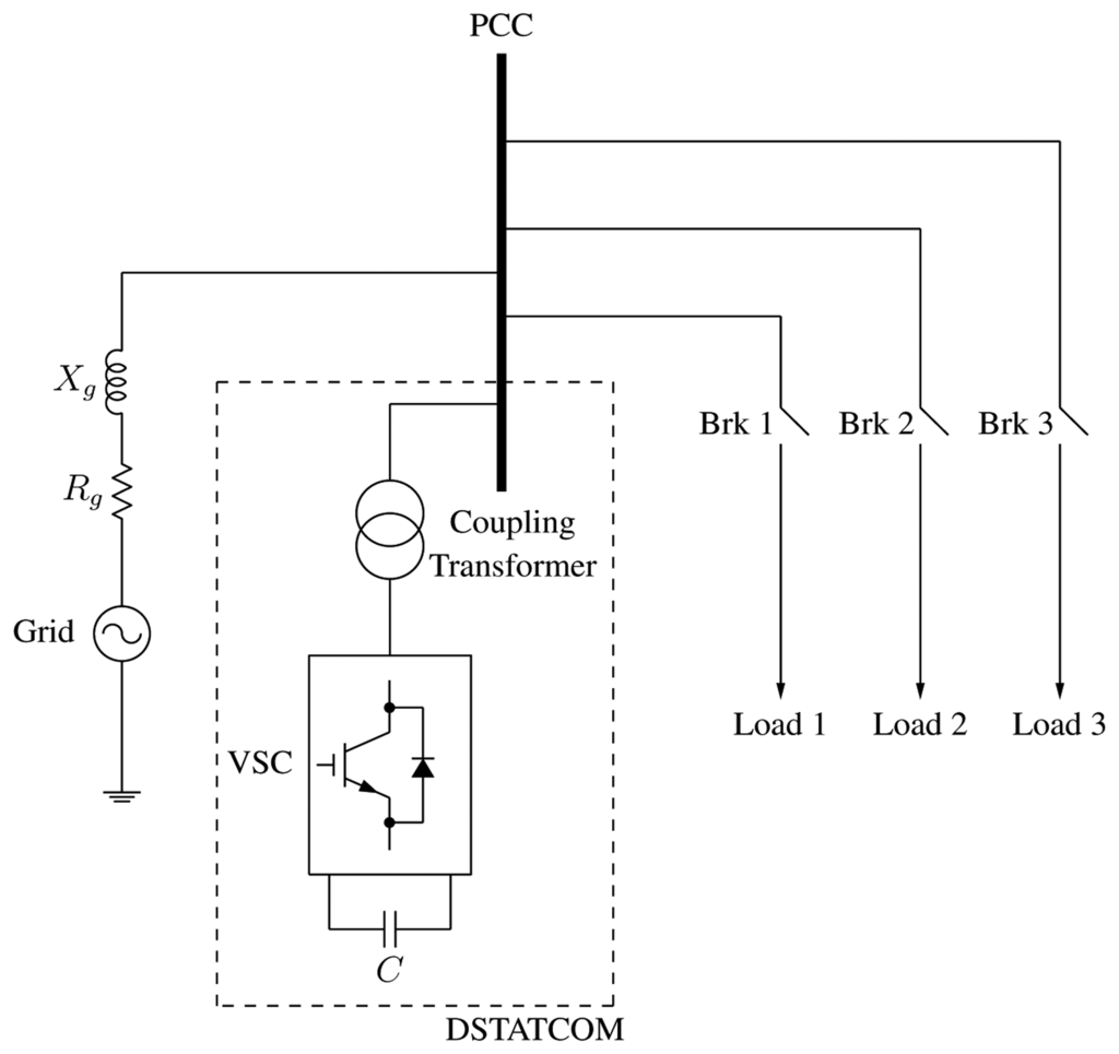Static synchronous compensators (STATCOM) and distribution static synchronous compensators (DSTATCOM) are two FACTS devices based on a voltage-source converter (VSC), which are widely used to improve voltage regulation and harmonic elimination and to balance the grid current [5,6]; they play a key role within the smart grid concept. They can therefore contribute toward enhancing power quality and obtaining a more reliable electricity grid.
