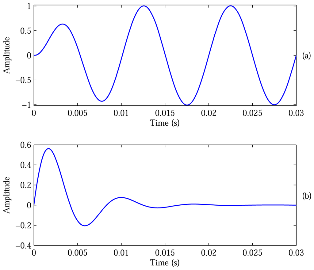 The design procedure to obtain the parameters of Regulator (17) is explained in [35] and uses the frequency response of the open loop transfer function. The previously established design specifications yield a phase-lead compensator for the term, RPL(s), of Controller (17), with the following parameters: k = 793.02, T = 2.4 · 10−3 and f = 0.05. Figure 10 shows the Bode diagram of the frequency response obtained with Rig(s), showing a phase margin of 60° at ωo = 1.5ω2, whereas the resulting time response of the closed-loop system when the reference is a sinusoidal input of frequency 2ω1 is plotted in Figure 11a; a perfect tracking is achieved in less than two periods of the input. Moreover, Figure 11b shows the time response of the closed-loop system for a sinusoidal disturbance input of frequency 2ω1; in this case, the control system is also able to reject the disturbance.