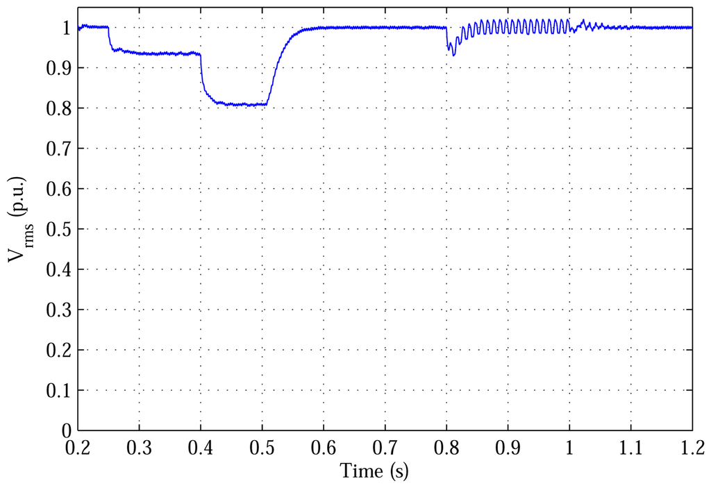 Figure 12 shows the RMS voltage at the PCC: the voltage sags caused by the connections of Load 1 and Load 2 can be clearly seen at instants t = 0.25 s and t = 0.4 s, respectively. When the DSTATCOM begins to regulate the PCC voltage, the balanced voltage sag is completely canceled out, and the time response of the PCC voltage does not have any overshoot. Nevertheless, when the unbalanced fault occurs at t = 0.8 s, the DSTATCOM control system is not able to compensate for the voltage imbalance until the controller used to balance the grid current is connected at t = 1 s. During this time interval, the RMS voltage at the PCC contains not only a DC component, but also a second harmonic component. Once the grid-current regulator is connected, the DSTATCOM is able to balance the voltage at the PCC. The three line-to-neutral voltages at the PCC for the interval 0.46 s ≤ t ≤ 0.56 s are plotted in Figure 13a: it will be observed that all three line-to-neutral voltages have the same amplitude of 11.27 kV when the DSTATCOM has compensated for the balanced voltage sag (i.e., from t = 0.5 s). Moreover, the three waveforms contain a very low distortion.