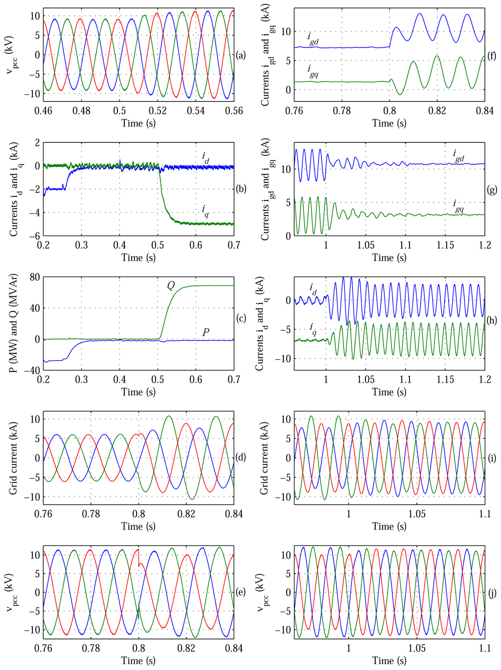 Figure 13b shows the d and q components of the current injected into the grid by the DSTATCOM for the time interval 0.2 s ≤ t ≤ 0.7 s; the time responses of both components are fully decoupled, and the current, id, is initially negative, as the DSTATCOM absorbs active power in order to charge the capacitors of the VSC (i.e., the DC capacitor and the flying capacitors) and to maintain the voltage in the DC capacitor at its reference value. This active-power absorption can be seen in Figure 13c, which plots the active and reactive powers injected into the grid: it will be noted that the active power is proportional to the current, id, and that the reactive power is proportional to the current, iq. At instant t = 0.5 s, the control system of the PCC voltage increases the reactive power injected into the grid in order to compensate for the voltage sag caused at t = 0.3 s, without active power consumption.