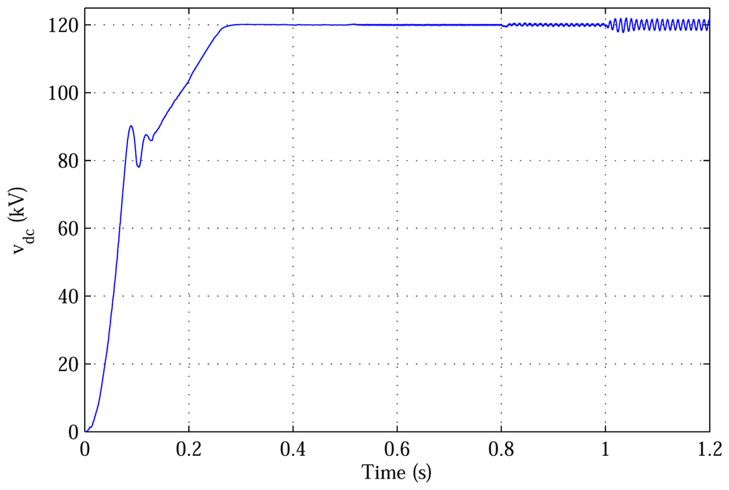 Having shown the design of the overall control system, details are now provided of a comprehensive simulation case: the DSTATCOM is initially connected to the grid; the control system of the voltage in the DC capacitor, the FC voltage control and the controllers for the currents, id and iq, operate at this time, and the remaining controllers have not yet been connected. Since the DC capacitor is discharged, the control system is responsible for increasing the capacitor charge until the DC voltage level reaches 120 kV, and the flying capacitors are also charged. Load 1 is connected at instant t = 0.25 s, causing a balanced voltage sag of 7%. In this situation, the DSTATCOM does not yet compensate for this voltage sag. Load 2 is connected at t = 0.4 s and produces a balanced voltage sag of approximately 20%. The PCC voltage control of the DSTATCOM is then connected at t = 0.5 s in order to compensate for the voltage sag by means of the reactive-power injection. Load 3 is connected to the PCC at instant t = 0.8 s, and a line-to-line short-circuit fault via a 4.2-Ω resistor involving Phases B and C occurs simultaneously at the PCC. The grid current is therefore unbalanced and causes a voltage imbalance at the PCC owing to the voltage drop in the line inductance. It should be stressed that neither the current imbalance nor the voltage imbalance contain a homopolar component, since the short-circuit fault involves only two phases without ground connection. In order to compensate for the imbalance of the current and, therefore, the voltage imbalance, the control system used to balance the grid current is connected at t = 1 s. The total simulation time is 1.2 s.