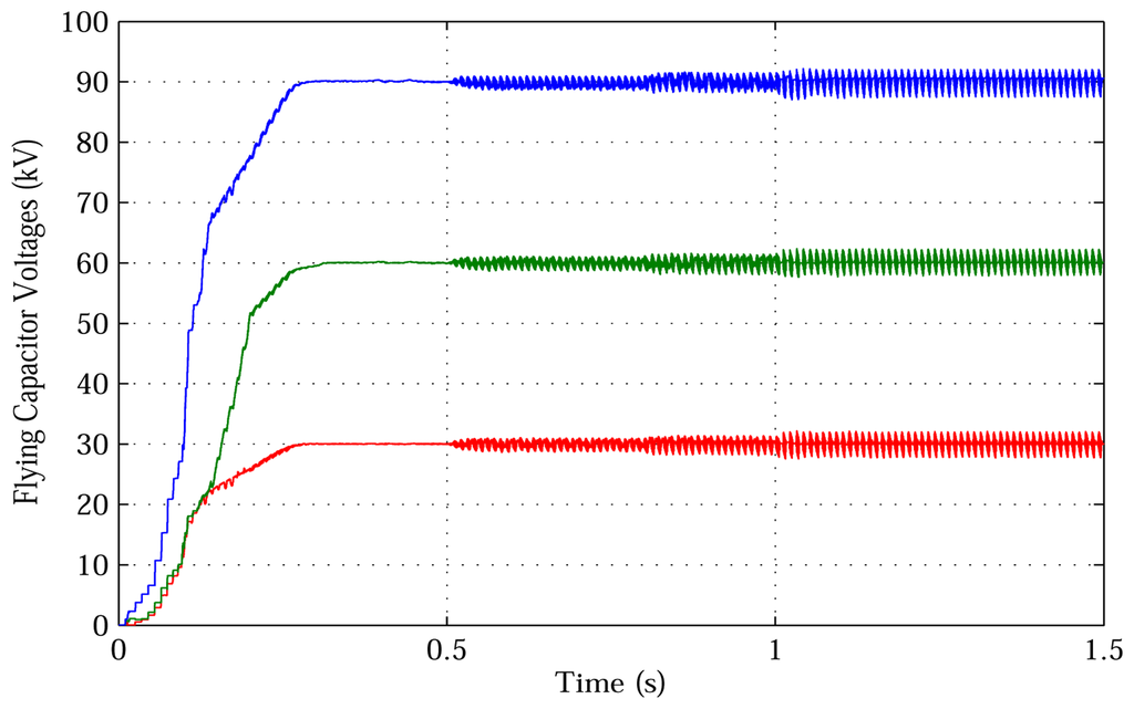 Figure 15 shows the flying capacitor voltages corresponding to leg A of the VSC depicted in Figure 3. The FC voltages of the other two legs of the VSC have been omitted for reasons of simplicity. The amplitude of the square wave was initially set to 30 kV in order to charge the flying capacitors to their references, namely 90 kV for C1, 60 kV for C2 and 30 kV for C3. Once the FC voltages are equal to their references, the amplitude of the square wave is reduced to 5 kV at t = 0.3 s, and the control system maintains the voltage in the flying capacitors constant and balanced, despite the voltage sags at the PCC and the imbalances of the grid current.