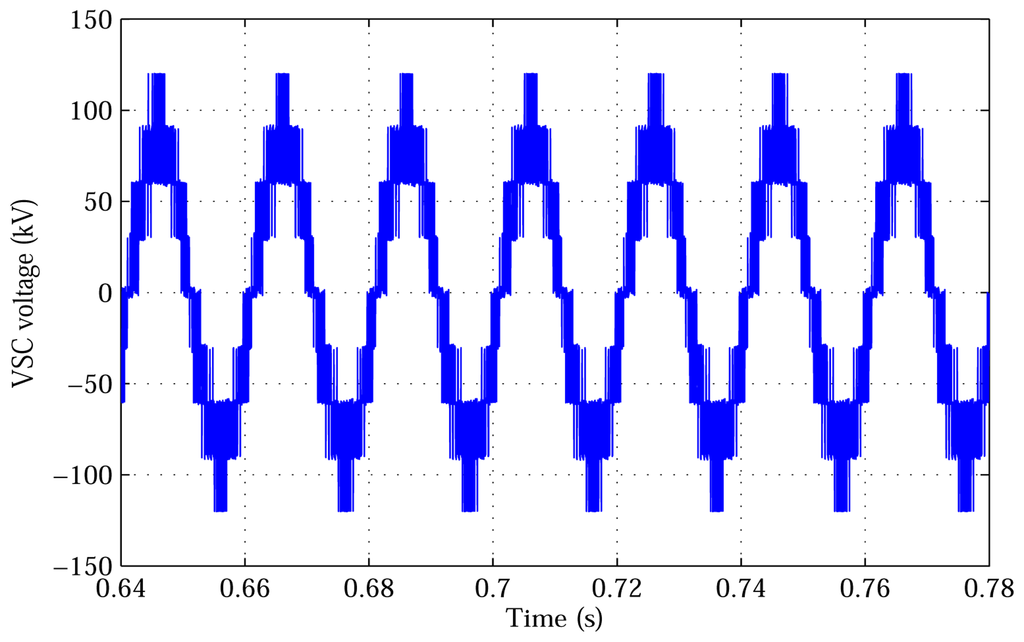 The line-to-line output voltage of the five-level FC VSC corresponding to the time interval 0.64 s ≤ t ≤ 0.78 s is plotted in Figure 16: the line-to-line output voltage contains nine levels (i.e., 2n − 1 levels) and is close to a sinusoidal waveform with a small harmonic distortion, which implies an advantage over the more conventional two-level and three-level VSC topologies.