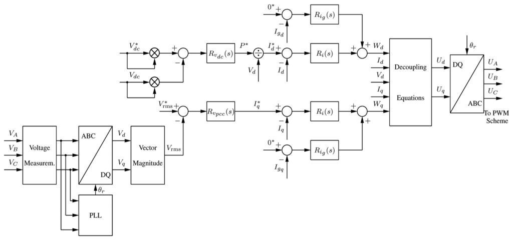 The voltage in the DC capacitor is controlled by means of the current, id, with a configuration of two nested feedback chains. The inner control loop employs the controller, Ri(s), and is tailored to respond much faster than the outer control loop, which uses the regulator, Rvdc(s). As one of the objectives of the overall control system is to achieve zero-tracking error in steady state for step changes in the reference, both regulators use an integral action.