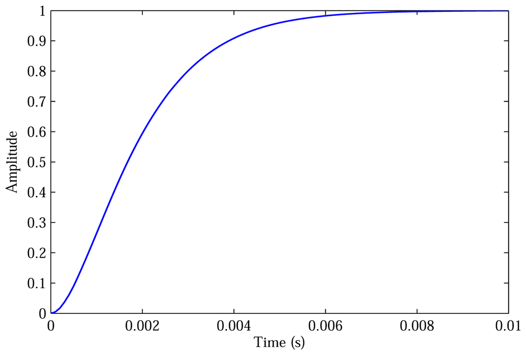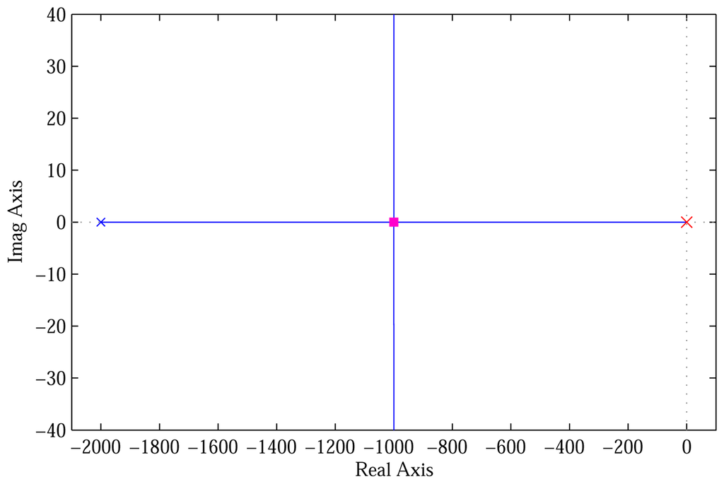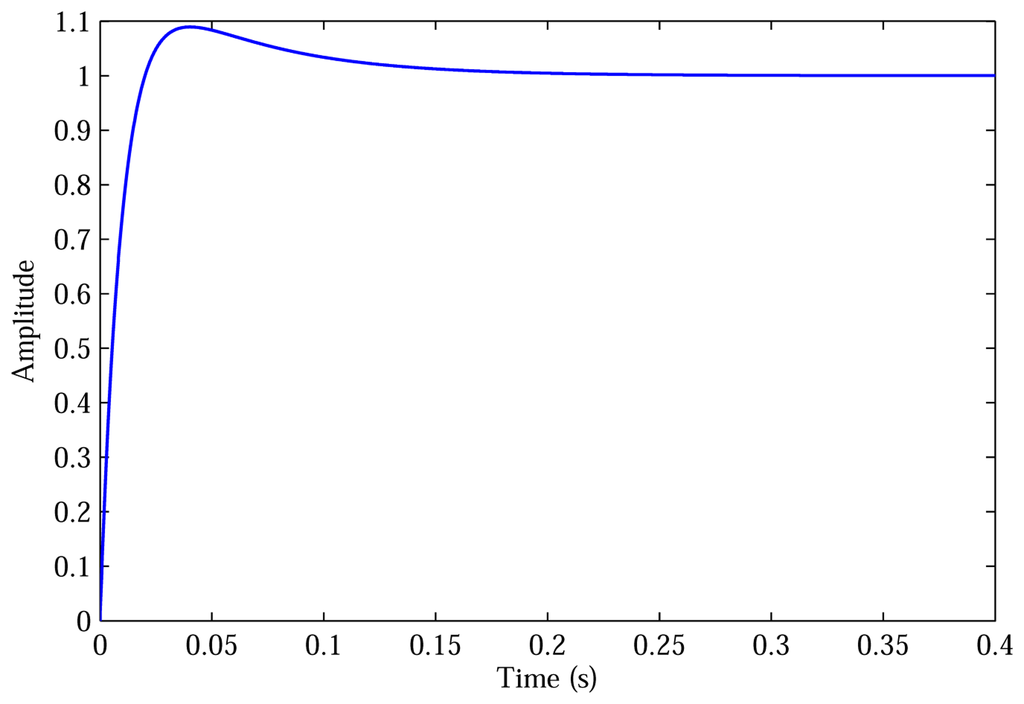 The different regulators in the control system have been designed using the root-locus and the frequency-response techniques. The controllers, Ri(s), are designed using System (10) and must be tailored to obtain a faster time response for the inner control loop than the outer control loop. This signifies that it is not necessary to pay attention to their dynamics when designing the remaining controllers. In order to obtain a fast time response with no overshoot and since the inner control loop contains two poles, the design criterion has been to choose two equal real poles with location s1 = s2 = −1, 000, as shown in Figure 6 in which the closed-loop system poles have been plotted using a square. The resultant gains of controller (11) are ki = 5,000 and kp = 9.993. The time response for a step input in the reference is plotted in Figure 7, which shows that the 1% settling time is lower than 7 ms and that there is no overshoot.