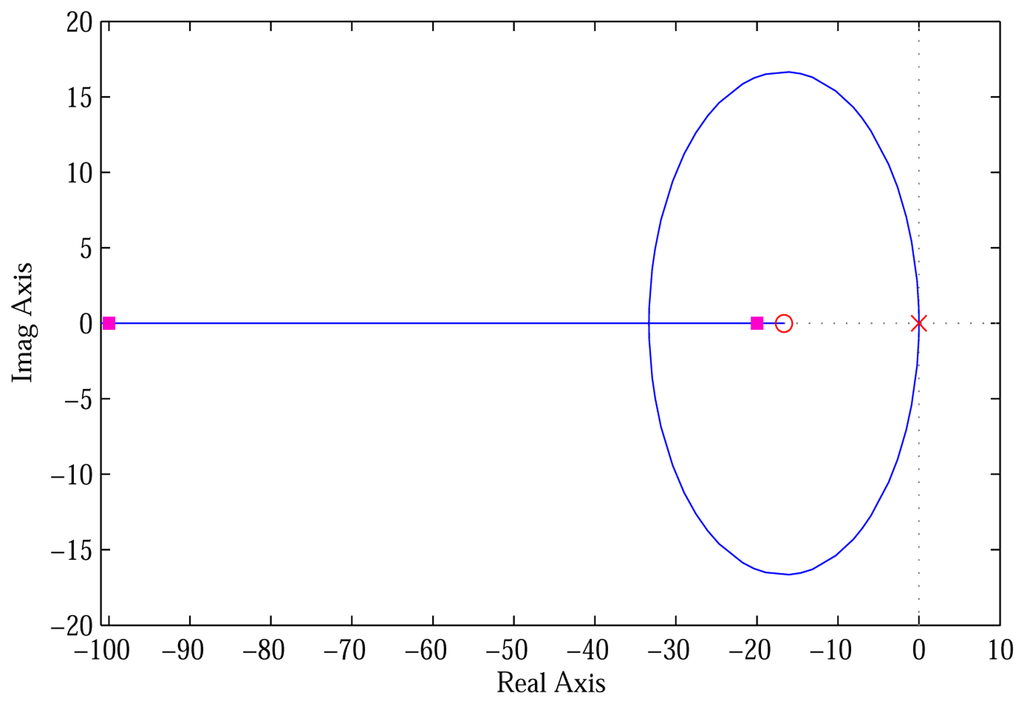 The controller, Rvdc(s), must be designed to obtain a time response that is much slower than the inner control loop response. Under this design constrain, the controller gains are calculated by ignoring the dynamics of the inner control loop. In this case study, the desired locations of the poles of the closed-loop system are s1 = −100 and s2 = −20, which is the dominant pole. The dynamics associated with pole s1 can therefore be ignored in comparison with that obtained with pole s2 [35]. Figure 8 shows the pole location of the closed-loop system (i.e., s1 = −100 and s2 = −20) for the voltage control of the DC capacitor. The gains of the controller (14) obtained for this location are kidc = −0.6 and kpdc = −0.036. Figure 9 plots the time response for a step change in the reference: in this case, the regulator, Rvdc(s), introduces a zero in the transfer function of the closed-loop system, which causes a 9% overshoot, while the 1%-settling time is 160 ms.