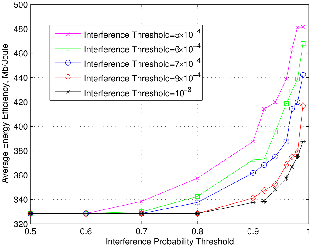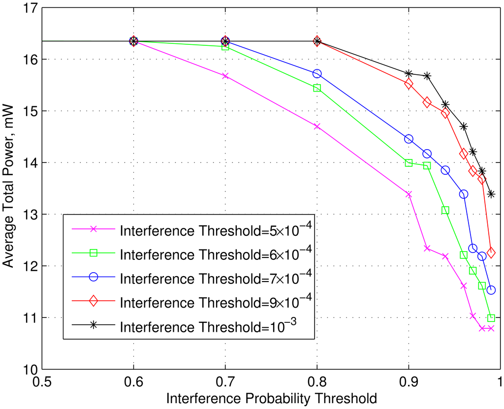 The effect of interference probability threshold on the channel access probability, total power and energy efficiency are shown in Figures 8, 9 and 10 respectively for different interference thresholds. Note that these two interference parameters, namely the interference threshold and interference probability threshold, are specified by the PU networks depending on its QoS requirements. These curves show the performance of SU for different pairs of these parameters. It can be seen from the Figure 8 that the channel access probability decreases with the interference threshold for a particular interference probability threshold. It makes sense because as the interference threshold gets tighter, less channel realization can give a feasible region and hence the channel access probability decreases. The SU transmitter need to use less power in order to meet the interference constraints (7) for the tighter interference threshold as can be seen in Figure 9. Since the total power decreases, the energy efficiency in Figure 10 increases. For a particular value of interference threshold, similar effect is seen for tighter interference probability threshold. It can be explained similarly using Equation (7) since tighter bound requires use of less power in order to satisfy interference constraint, which makes rate thresholds infeasible for greater number of sets of channel realizations.