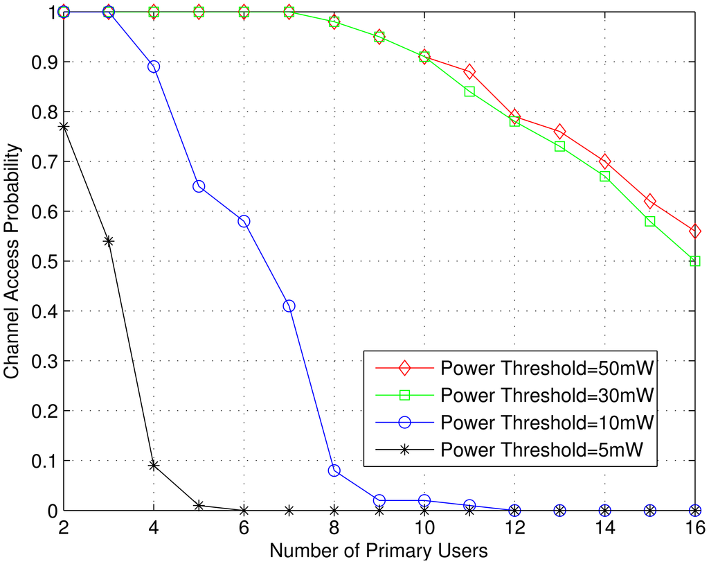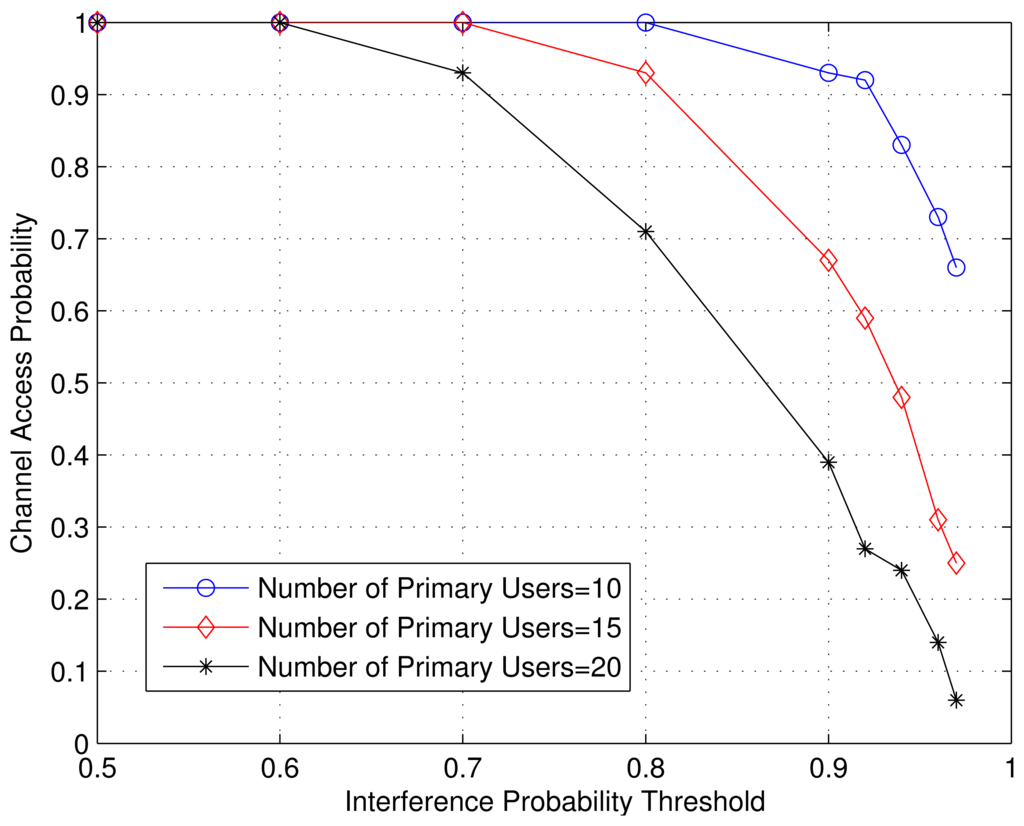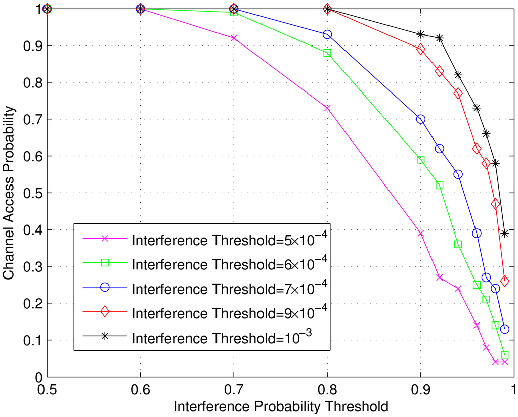 In this section, we present numerical simulation results for the channel access probability, average energy efficiency and average total transmitted power with different interference parameters, power and rate thresholds, and number of interfering primary users using both the CCT and Dinkelbach formulations. Both the CCT and Dinkelbach formulations give the same optimal values. We conduct Monte Carlo simulations by generating several set of channel samples for Rayleigh fading channel and average the optimal energy efficiency and the optimal total power over the number of set of samples. Unless specified otherwise, the values for different system parameters for the Monte Carlo simulations are as follows: the duration of OFDM symbol, Ts = 1 μs, static circuit power, pc = 10−6 mW, noise power variance, σ2 = 0.1 mW, the total transmitter power threshold, PT = 50 mW, number of subcarriers, N = 16, bandwidth of each subcarrier, Δf = 312.5 kHz, average channel power gain of the SU link, , average channel power gain between SU transmitter and PU receiver, , number of PU channels, M = 10, the rate threshold, Cth = 5 × 106 bits/sec, interference threshold, , interference probability threshold , bandwidth of each PU, B = 1 MHz, interference contribution of each PU is Rayleigh distributed with standard deviation 10−4.