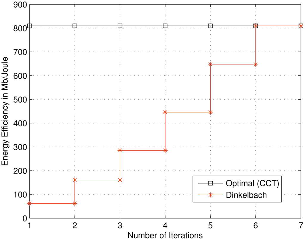 Another mathematically less cumbersome technique that does not require the transformation is an iterative solution technique of the fractional programming problem based on the Dinkelbach method [39]. In this algorithm, the objective of the fractional programming problem is first transformed into a parametric optimization problem, then ε-optimal solutions are obtained iteratively, where ε is the tolerance of convergence. Let q ∈ ℝ denote a real-valued parameter such that F(p, q) = maxp∈S [f(p) − qg(p)]. Therefore, F(p, q) is continuous for q ∈ ℝ, strictly monotonic and concave over ℝ [39]. There is a one-to-one relationship between the solutions of the fractional programming formulation and iterative concave programming with parametric objective as stated by the following theorem: