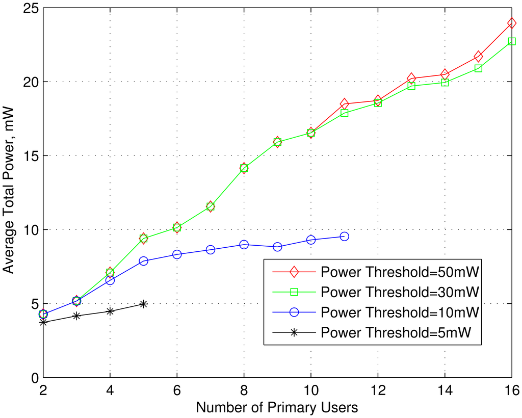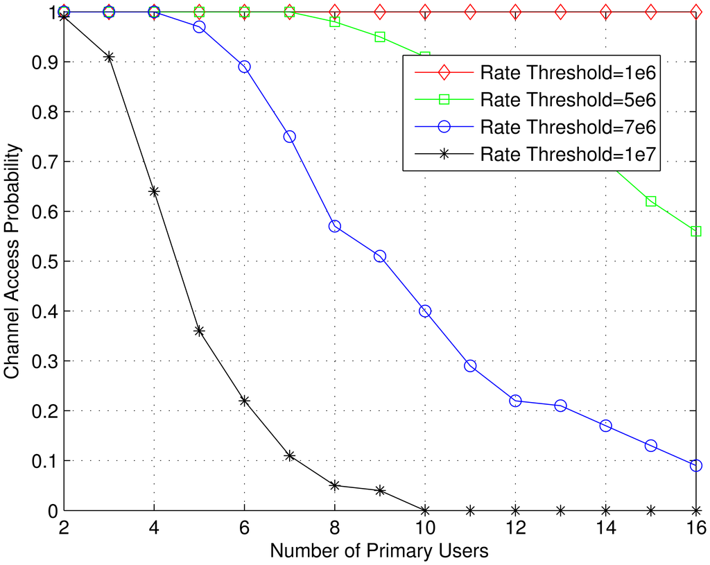 In Figures 4, 5 and 6, we have shown the effect of number of PUs on the channel access probability, average total subcarrier power and average energy efficiency for different power thresholds. For a particular value of power threshold, the channel access probability decreases with the increase of number of PUs. Because more PUs causes more interference to the SU's receiver. Also, the SU transmitter need to maintain interference constraints of additional PUs. As a results, the average numbers of channel realization for which all the constraints, given other bounds remain the same, need to satisfied decreases. Thus, the SU need to raise the power to counteract the increased number of PUs, as can be seen from Figure 6. Since for the same rate threshold the power increases, the energy efficiency decreases with the increase of number of PUs as in Figure 5. It is also seen that as the power threshold decreases, the channel access probability also decreases. For PT = 5 mW, the channel access probability is zero for M = 6 or more PUs. The effect of rate threshold on the channel access probability is shown in Figure 7. It is seen that for a particular number of PUs, the channel access probability decreases as the rate threshold increases. Because in order to achieve higher rate, the SU transmitter need to use higher transmitter power, which in turns disqualify many sets of channel samples for which there existed a feasible region before.