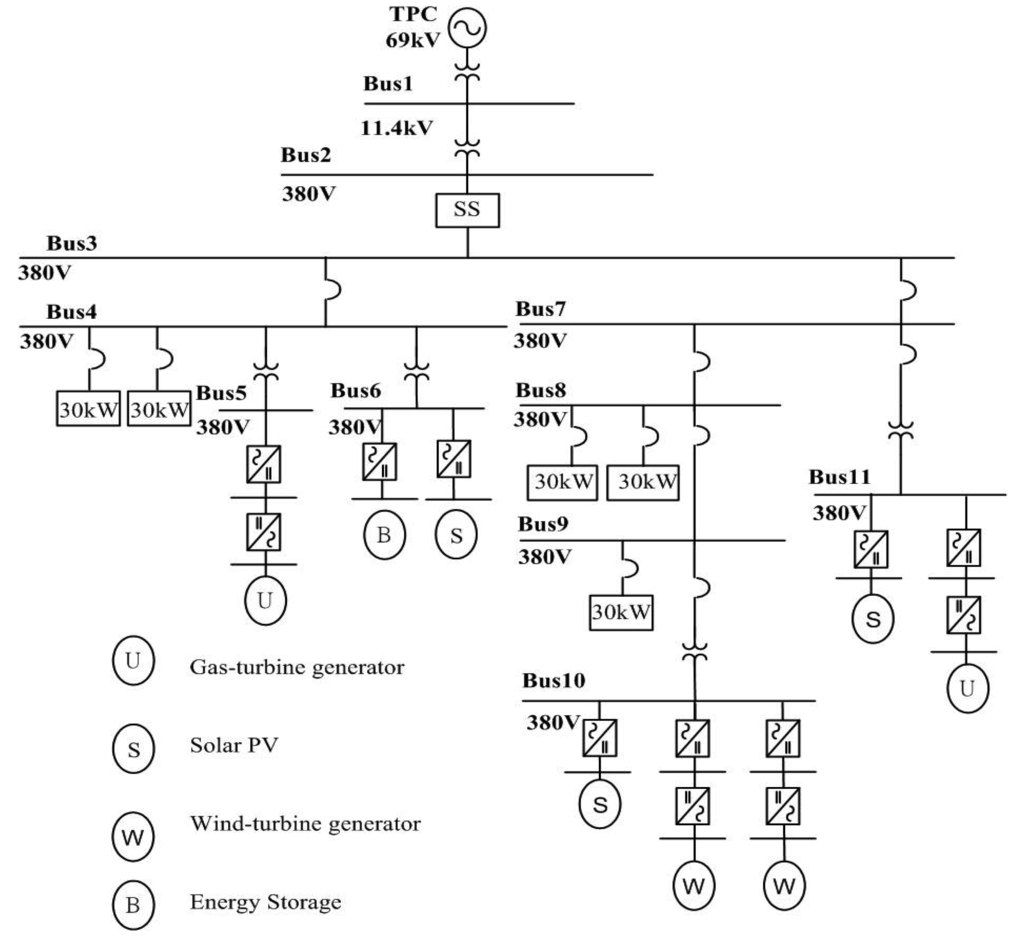 The studied microgrid has 11 AC buses. Figure 1 illustrates the one-line diagram of this microgrid with rectifiers, buck/boost converters, and inverters, which will be fully considered in the transient/dynamic simulation. The microgrid testbed (380 V) is planned to cover three zones: