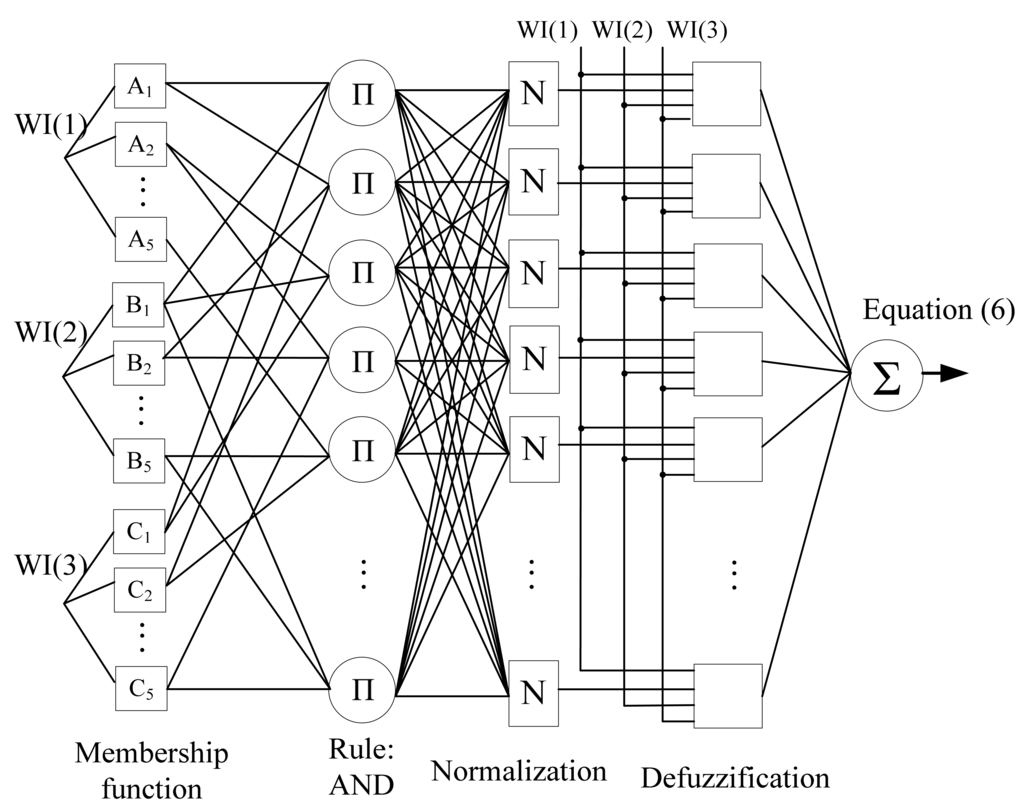 The structure of ANFIS can be explained as follows: the first layer in Figure 2 is the input layer; the second layer includes the membership functions, which are the same as the activation functions in the neural network, of the fuzzy rules. Each membership (activation) function can be expressed as follows: