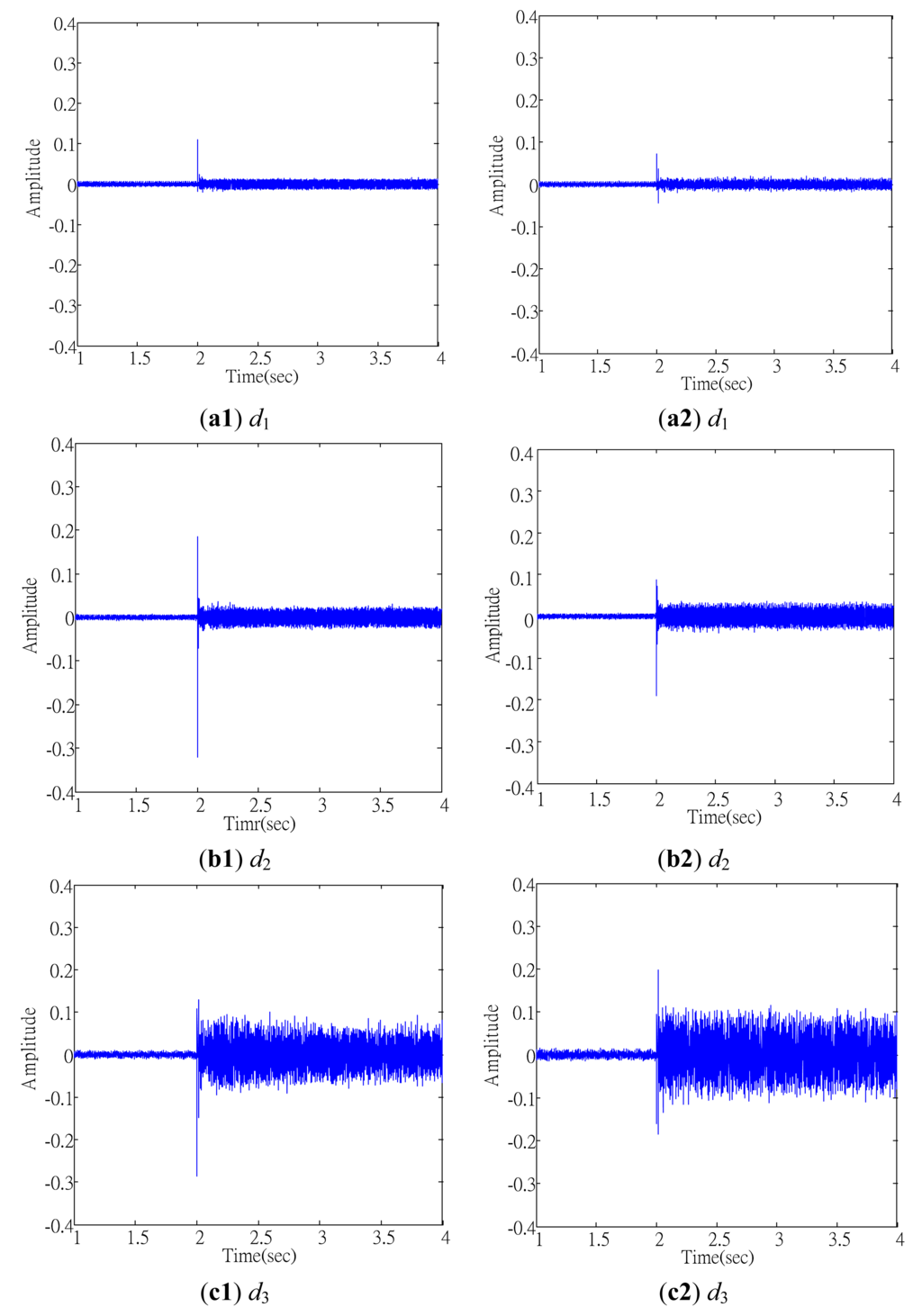 Figure 3 shows the wavelet coefficients of voltages at PCC determined from the scenarios in which individual faults occur at Buses 1 and 5 (i.e., outside and inside the microgrid). Figure 3 does not consider the action of static switch because the effect of wavelet coefficients is addressed. Duration of the fault is 2 s in the simulation (t = 2–4 s); however, only 1/4 of the first cycle is used in the proposed method. Obviously, d2 is the most suitable wavelet coefficient for detecting the occurrence of a fault transient. Specifically, a sufficiently large d2 occurs at t = 2 s compared with other d2. However, the value of d1 at t = 2 s is not sufficiently large and values of d3 oscillate after t = 2 s. These imply d1 and d3 are inappropriate for the usage of detection. Any transient and noise may be included in the measured signals. However, the DWT can still identify the most appropriate scale (j = 2 herein) because different scales (j = 1, 2, 3) cover different frequency bands.